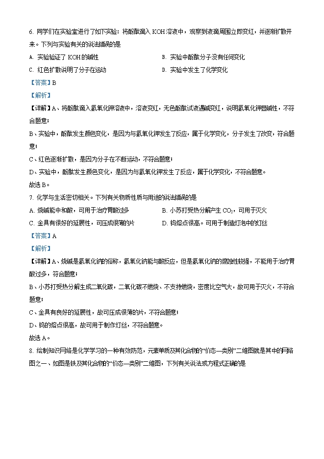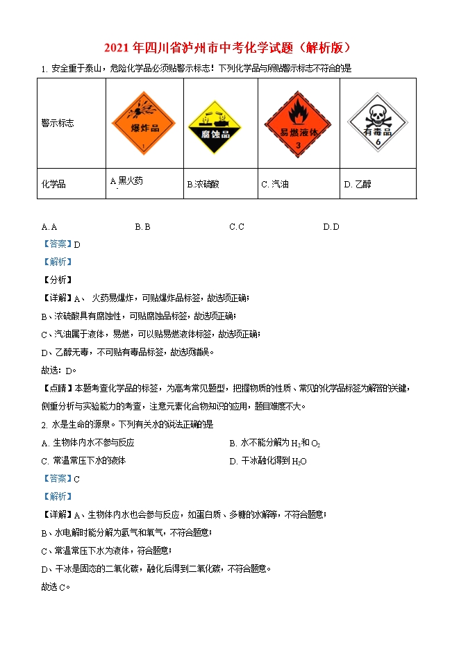 【内容简介】水是生命的源泉。下列有关水的说法正确的是A. 生物体内水不参与反应 B. 水不能分解为H2和O2C. 常温常压下水的液体 D. 干冰融化得到H2O【答案】C【解析】【详解】A、生物体内水也会参与反应,如蛋白质、多糖的水解等,不符合题意;B、水电解时能分解为氢气和氧气,不符合题意;C、常温常压下水为液体,符合题意;D、干冰是固态的二氧化碳,融化后得到二氧化碳,不符合题意。故选C。3. 化学与健康息息相关,下列有关说法正确的是A. 水果上市可往水果上喷洒农药 B. 过氧化氢溶液可作消毒剂C. 霉变食物洗后可继续食用 D. 坏血病是因为汞元素缺乏所致【答案】B【解析】【详解】A、农药有毒,水果上市后,不可往水果上喷洒农药,不符合题意;B、过氧化氢具有氧化性,可作消毒剂,符合题意;C、霉变的食物中含有黄曲霉毒素,具有致癌性,不能食用,不符合题意;D、缺乏维生素C,易得坏血病,不符合题意。故选B。4. 宋代<开宝本草>中记载了KNO3的提纯方法,“……所在山泽。冬月地上有霜,扫取以水淋汁后,乃煎炼而成”。提纯中不涉及到的实验方法是A. 溶解 B. 蒸发 C. 结晶 D. 升华【答案】D【解析】【详解】A、“扫取以水淋汁后”涉及到溶解,不符合题意;B、“乃煎炼而成”涉及到蒸发,不符合题意;C、“乃煎炼而成”涉及到蒸发,然后溶质浓缩结晶,也涉及到结晶,不符合题意;D、硝酸钾归属于盐,其性质难于升华,上述提纯方法也没有涉及到升华方法,符合题意。故选D。5. 化学通过解决能源、环境、材料与粮食等问题二推动社会发展。下列有关说法正确的是A. 液化氢气作为火箭燃料无污染 B. 酸性废水直接排放后再撒熟石灰处理......