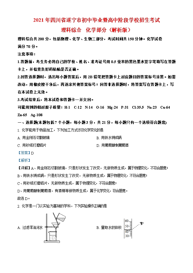 【内容简介】一、选择题(本题包括7个小题,每小题3分,共21分,每小题只有一个选项符合题意)1. 化学能用于物品加工,下列加工方式涉及化学变化的是A. 用金刚石切割玻璃 B. 用铁水铸成锅C. 用砂纸打磨铝片 D. 用葡萄酿制葡萄酒【答案】D【解析】【详解】A、用金刚石切割玻璃,只是形状发生了改变,无新物质生成,属于物理变化,不符合题意;B、用铁水铸成锅,只是形状发生了改变,无新物质生成,属于物理变化,不符合题意;C、用砂纸打磨铝片,无新物质生成,属于物理变化,不符合题意;D、用葡萄酿制葡萄酒,有酒精等新物质生成,属于化学变化,符合题意。故选D。2. 化学是一门以实验为基础的学科,下列实验操作正确的是A. 过滤浑浊河水 B. 量取水的体积 C. 加热食盐水 D. 稀释浓硫酸 【答案】A【解析】【详解】A、过滤注意一贴二低三靠,并使用玻璃棒引流,正确;B、量取水的体积读数时,视线要与凹液面最低处保持水平,错误;C、加热食盐水,试管中液体体积不能超过试管容积的三分之一,错误;D、稀释浓硫酸时要把浓硫酸倒入水中并不断搅拌,错误。故选A。3. 腺嘌呤核苷三磷酸又称为三磷酸腺苷,简称ATP,水解时释放出能量较多,是生物体内最直接的能量来源。ATP的化学式是C10H16N5O13P3,下列有关说法正确的是A. ATP是氧化物B. ATP中碳、氧元素质量比为10:13C. ATP中氢元素的质量分数最小......