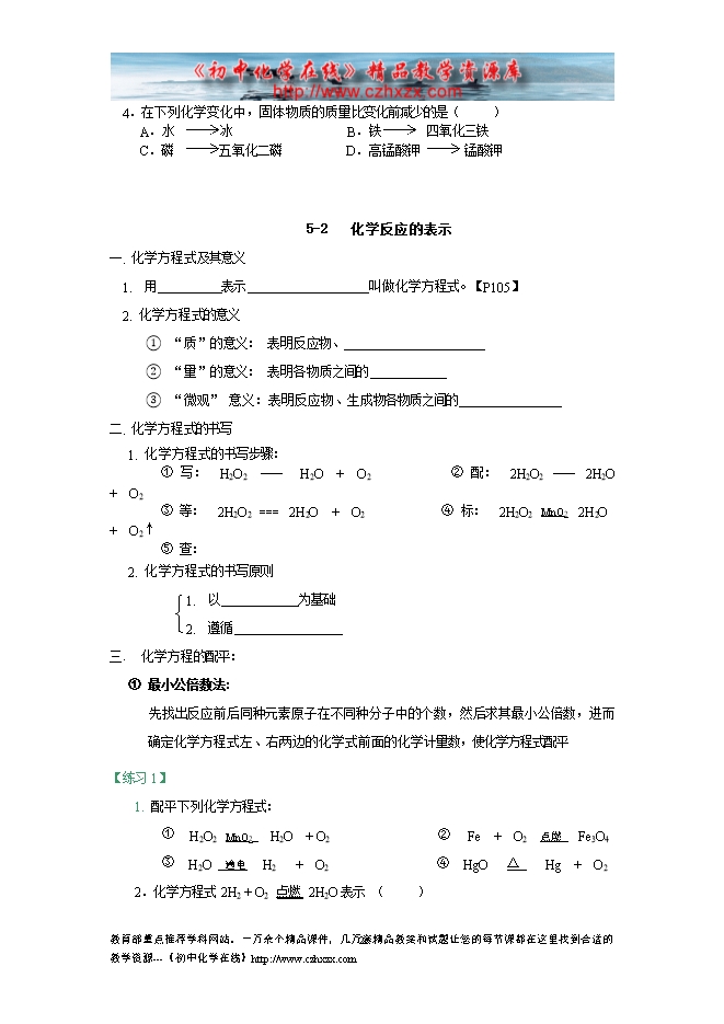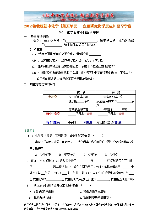 2012鲁教版初中化学《第五单元 定量研究化学反应》复习学案