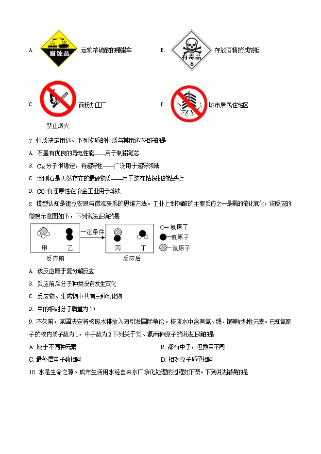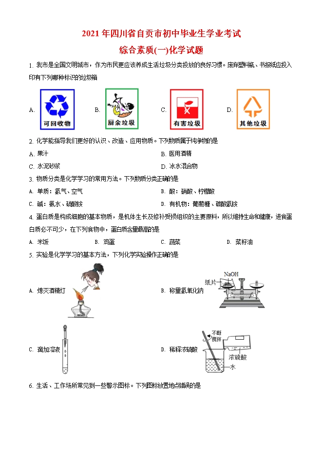 【内容简介】2. 化学能指导我们更好的认识、改造、应用物质。下列物质属于纯净物的是A. 果汁 B. 医用酒精C. 水泥砂浆 D. 冰水混合物3. 物质分类是化学学习的常用方法。下列物质分类正确的是A. 单质:氢气、空气 B. 酸:硝酸、柠檬酸C. 碱:氨水、硫酸铵 D. 有机物:葡萄糖、碳酸氢铵4. 蛋白质是构成细胞的基本物质,是机体生长及修补受损组织的主要原料,所以维持生命和健康,进食蛋白质必不可少,在下列食物中,蛋白质含量最高的是A. 米饭 B. 鸡蛋 C. 蔬菜 D. 菜籽油5. 实验是化学学习的基本方法,下列化学实验操作正确的是A. 熄灭酒精灯 B. 称量氢氧化钠 C. 滴加溶液 D. 稀释浓硫酸 6. 生活、工作场所常见到一些警示图标。下列图标放置地点错误的是......