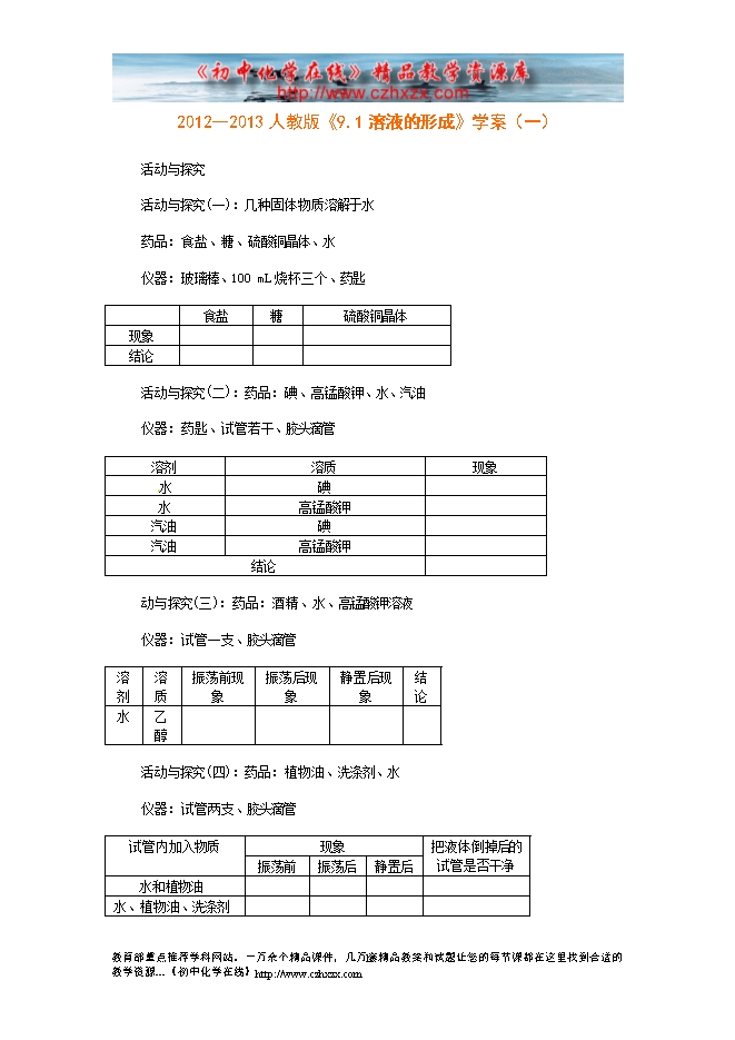 2012--2013人教版《9.1溶液的形成》学案(一)