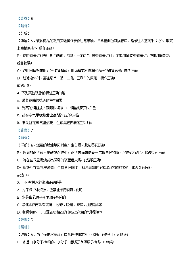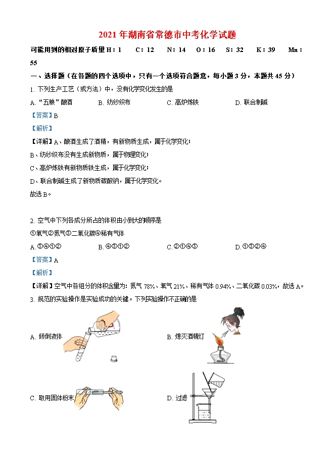 【内容简介】一、选择题(在各题的四个选项中,只有一个选项符合题意,每小题3分,本题共45分)1. 下列生产工艺(或方法)中,没有化学变化发生的是A. “五粮”酿酒 B. 纺纱织布 C. 高炉炼铁 D. 联合制碱【答案】B【解析】【详解】A、酿酒生成了酒精,有新物质生成,属于化学变化;B、纺纱织布没有生成新物质,属于物理变化;C、高炉炼铁有新物质铁生成,属于化学变化;D、联合制碱生成了新物质碳酸钠,属于化学变化。故选B。2. 空气中下列各成分所占的体积由小到大的顺序是①氧气②氮气③二氧化碳④稀有气体A. ③④①② B. ④③①② C. ②①④③ D. ①③②④【答案】A【解析】【详解】空气中各组分的体积含量为:氮气78%、氧气21%、稀有气体0.94%、二氧化碳0.03%,故选A。3. 规范的实验操作是实验成功的关键。下列实验操作不正确的是......