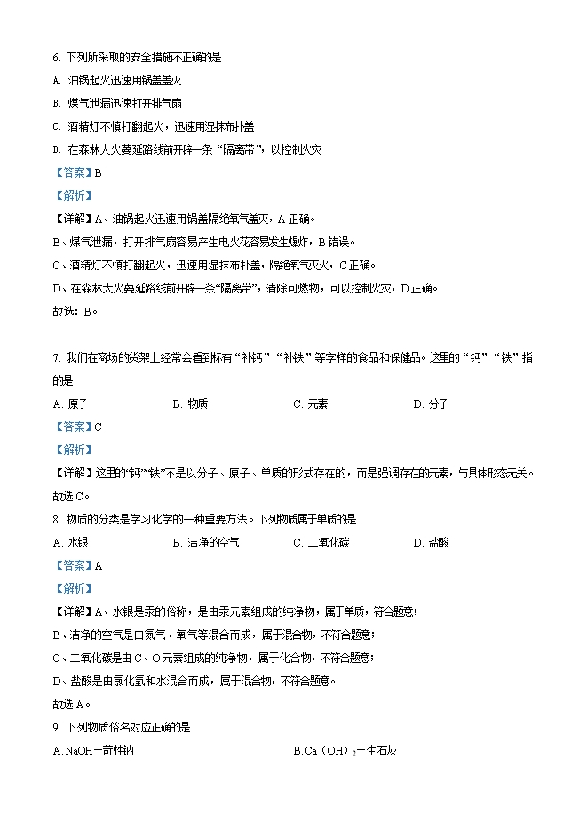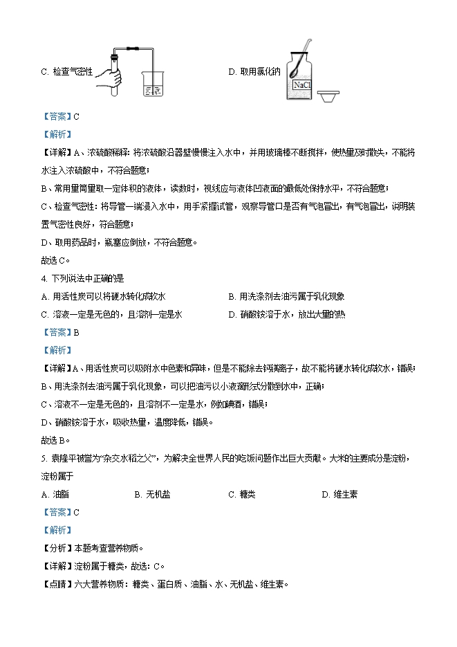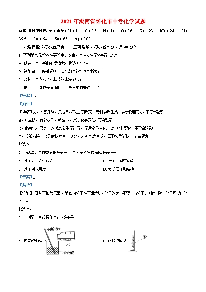 【内容简介】一、一、选择题(每小题只有一个正确选项,每小题2分,共40分)1. 下列是常见仪器在实验室的对话,其中发生了化学变化的是A. 试管:“同学们不爱惜我,我被摔碎了。”B. 铁架台:“好难受啊!我在潮湿的空气中生锈了。”C. 烧杯:“热死了,我装的冰块不见了。”D. 漏斗:“滤液好浑浊呀!我嘴里的滤纸破了。”【答案】B【解析】【详解】A、试管摔碎,只是形状发生了改变,无新物质生成,属于物理变化,不符合题意;B、铁生锈,有新物质铁锈生成,属于化学变化,符合题意;C、冰融化,只是水的状态发生了改变,无新物质生成,属于物理变化,不符合题意;D、滤纸破损,只是形状发生了改变,无新物质生成,属于物理变化,不符合题意。故选B。2. 俗话说:“酒香不怕巷子深”。从分子的角度解释正确的是A. 分子大小发生改变 B. 分子之间有间隔C. 分子可以再分 D. 分子在不断运动【答案】D【解析】【详解】“酒香不怕巷子深”,是因为分子在不断运动,分子的大小不变,与分子之间有间隔、分子可以再分无关。故选D。3. 下列图示实验操作中,正确的是A. 浓硫酸稀释 B. 读取液体积 C. 检查气密性 D. 取用氯化钠 【答案】C【解析】【详解】A、浓硫酸稀释:将浓硫酸沿器壁慢慢注入水中,并用玻璃棒不断搅拌,使热量及时散失,不能将水注入浓硫酸中,不符合题意;B、常用量筒量取一定体积的液体,读数时,视线应与液体凹液面的最低处保持水平,不符合题意;C、检查气密性:将导管一端浸入水中,用手紧握试管,观察导管口是否有气泡冒出,有气泡冒出,说明装置气密性良好,符合题意;D、取用药品时,瓶塞应倒放,不符合题意。故选C。4. 下列说法中正确的是A. 用活性炭可以将硬水转化成软水 B. 用洗涤剂去油污属于乳化现象C. 溶液一定是无色的,且溶剂一定是水 D. 硝酸铵溶于水,放出大量的热【答案】B【解析】【详解】A、用活性炭可以吸附水中色素和异味,但是不能除去钙镁离子,故不能将硬水转化成软水,错误;B、用洗涤剂去油污属于乳化现象,可以把油污以小液滴形式分散到水中,正确;C、溶液不一定是无色的,且溶剂不一定是水,例如碘酒,错误;D、硝酸铵溶于水,吸收热量,温度降低,错误。......