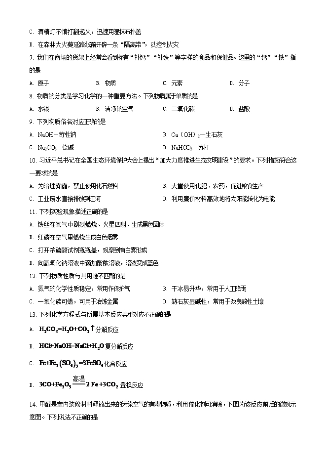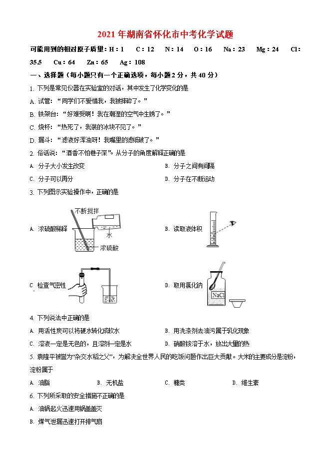 【内容简介】一、选择题(每小题只有一个正确选项,每小题2分,共40分)1. 下列是常见仪器在实验室的对话,其中发生了化学变化的是A. 试管:“同学们不爱惜我,我被摔碎了。”B. 铁架台:“好难受啊!我在潮湿的空气中生锈了。”C. 烧杯:“热死了,我装的冰块不见了。”D. 漏斗:“滤液好浑浊呀!我嘴里的滤纸破了。”2. 俗话说:“酒香不怕巷子深”。从分子的角度解释正确的是A. 分子大小发生改变 B. 分子之间有间隔C. 分子可以再分 D. 分子在不断运动3. 下列图示实验操作中,正确的是A. 浓硫酸稀释 B. 读取液体积 C 检查气密性 D. 取用氯化钠 4. 下列说法中正确的是A. 用活性炭可以将硬水转化成软水 B. 用洗涤剂去油污属于乳化现象......