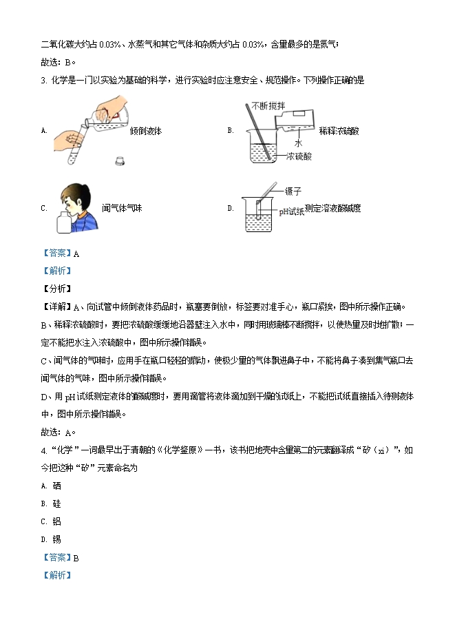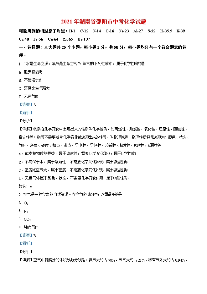 【内容简介】一、选择题:本大题共25个小题,每小题2分,共50分,每小题均只有一个符合题意的选项。1. “水是生命之源,氧气是生命之气”。氧气的下列性质中,属于化学性质的是A. 能支持燃烧B. 不易溶于水C. 密度比空气略大D. 无色气体【答案】A【解析】【分析】【详解】物质在化学变化中表现出来的性质叫化学性质,如可燃性、助燃性、氧化性、还原性、酸碱性、稳定性等;物质不需要发生化学变化就表现出来的性质,叫物理性质:物理性质经常表现为:颜色、状态、气味、密度、硬度、熔点、沸点、导电性、导热性、溶解性、挥发性、吸附性、延展性等。A、能支持物质的燃烧,属于助燃性,需要化学变化体现,属于化学性质;B、不易溶于水,属于溶解性,不需要化学变化体现,属于物理性质;C、密度比空气大,属于密度,不需要化学变化体现,属于物理性质;D、无色气体属于颜色、状态,不需要化学变化体现,属于物理性质。故选:A。2. 空气是一种宝贵的自然资源。在空气的成分中,含量最多的是A. O2B. N2C. CO2D. 稀有气体【答案】B【解析】【分析】【详解】空气中各成分的体积分数分别是:氮气大约占78%、氧气大约占21%、稀有气体大约占0.94%、二氧化碳大约占0.03%、水蒸气和其它气体和杂质大约占0.03%,含量最多的是氮气;......