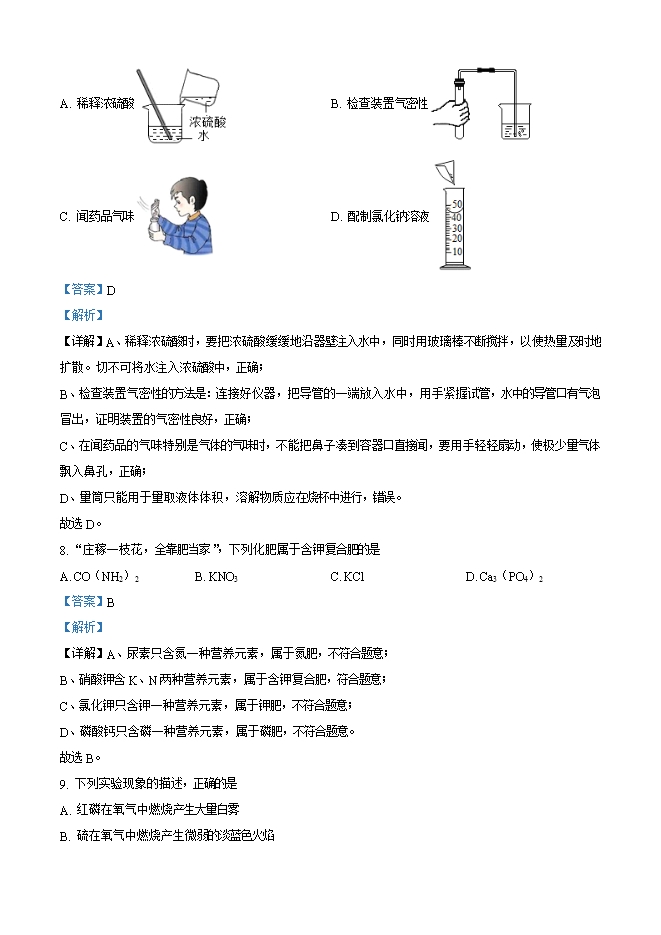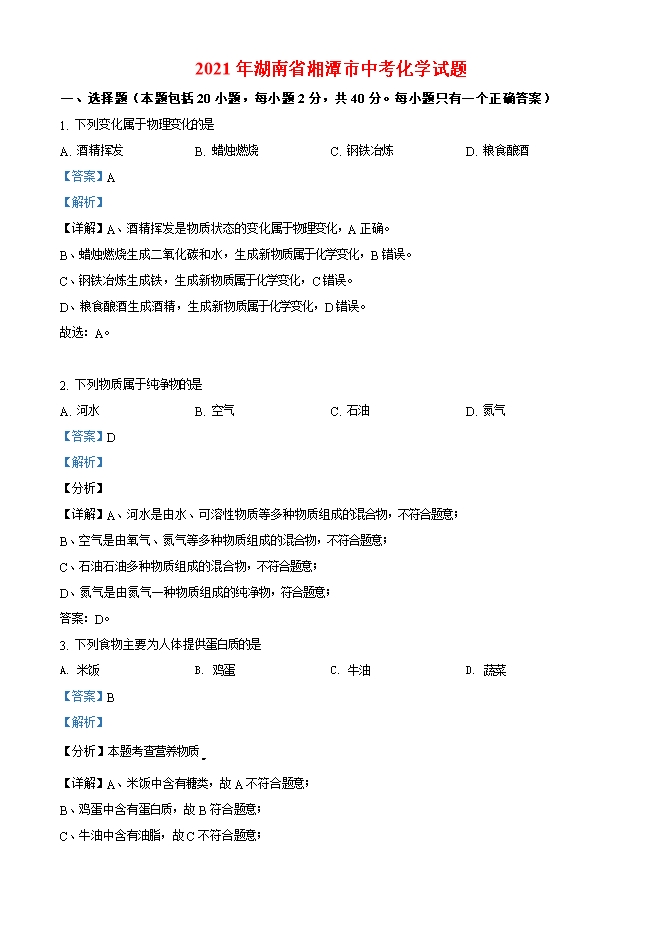 【内容简介】选择题(本题包括20小题,每小题2分,共40分。每小题只有一个正确答案)1. 下列变化属于物理变化的是A. 酒精挥发 B. 蜡烛燃烧 C. 钢铁冶炼 D. 粮食酿酒【答案】A【解析】【详解】A、酒精挥发是物质状态的变化属于物理变化,A正确。B、蜡烛燃烧生成二氧化碳和水,生成新物质属于化学变化,B错误。C、钢铁冶炼生成铁,生成新物质属于化学变化,C错误。D、粮食酿酒生成酒精,生成新物质属于化学变化,D错误。故选:A。2. 下列物质属于纯净物的是A. 河水 B. 空气 C. 石油 D. 氮气【答案】D【解析】【分析】【详解】A、河水是由水、可溶性物质等多种物质组成的混合物,不符合题意;B、空气是由氧气、氮气等多种物质组成的混合物,不符合题意;C、石油石油多种物质组成的混合物,不符合题意;D、氮气是由氮气一种物质组成的纯净物,符合题意;答案:D。3. 下列食物主要为人体提供蛋白质的是A. 米饭 B. 鸡蛋 C. 牛油 D. 蔬菜【答案】B【解析】【分析】本题考查营养物质 【详解】A、米饭中含有糖类,故A不符合题意;B、鸡蛋中含有蛋白质,故B符合题意;C、牛油中含有油脂,故C不符合题意;......
