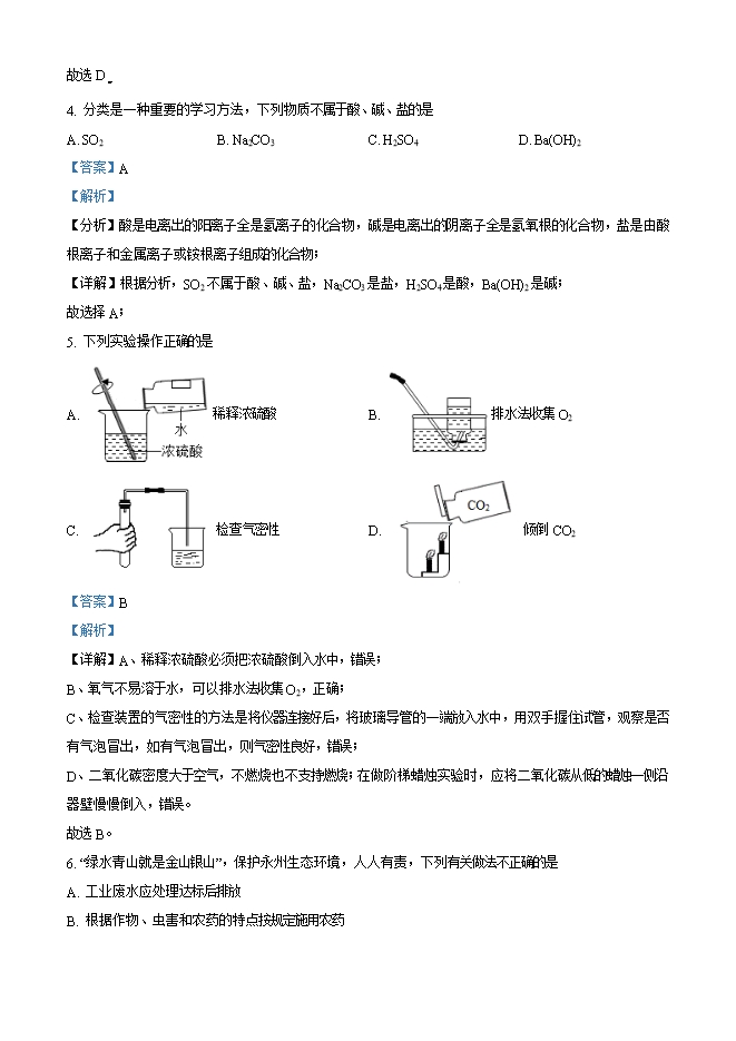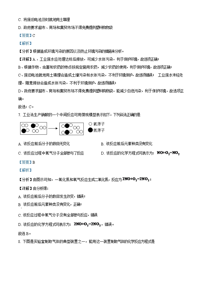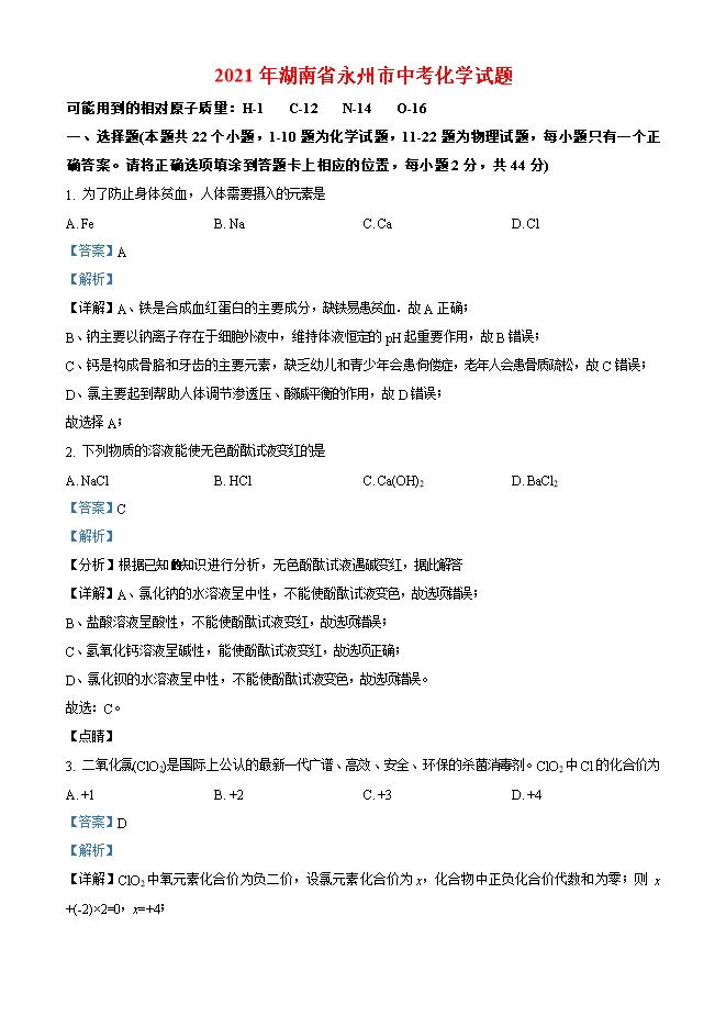 【内容简介】一、选择题(本题共22个小题,1-10题为化学试题,11-22题为物理试题,每小题只有一个正确答案。请将正确选项填涂到答题卡上相应的位置,每小题2分,共44分)1. 为了防止身体贫血,人体需要摄入的元素是A. Fe B. Na C. Ca D. Cl【答案】A【解析】【详解】A、铁是合成血红蛋白的主要成分,缺铁易患贫血.故A正确;B、钠主要以钠离子存在于细胞外液中,维持体液恒定的pH起重要作用,故B错误;C、钙是构成骨胳和牙齿的主要元素,缺乏幼儿和青少年会患佝偻症,老年人会患骨质疏松,故C错误;D、氯主要起到帮助人体调节渗透压、酸碱平衡的作用,故D错误;故选择A;2. 下列物质的溶液能使无色酚酞试液变红的是A. NaCl B. HCl C. Ca(OH)2 D. BaCl2【答案】C【解析】【分析】根据已知 知识进行分析,无色酚酞试液遇碱变红,据此解答【详解】A、氯化钠的水溶液呈中性,不能使酚酞试液变色,故选项错误;B、盐酸溶液呈酸性,不能使酚酞试液变红,故选项错误;C、氢氧化钙溶液呈碱性,能使酚酞试液变红,故选项正确;D、氯化钡的水溶液呈中性,不能使酚酞试液变色,故选项错误。故选:C。【点睛】3. 二氧化氯(ClO2)是国际上公认的最新一代广谱、高效、安全、环保的杀菌消毒剂。ClO2中Cl的化合价为A. +1 B. +2 C. +3 D. +4【答案】D【解析】【详解】ClO2中氧元素化合价为负二价,设氯元素化合价为x,化合物中正负化合价代数和为零;则 x +(-2)×2=0,x=+4;......
