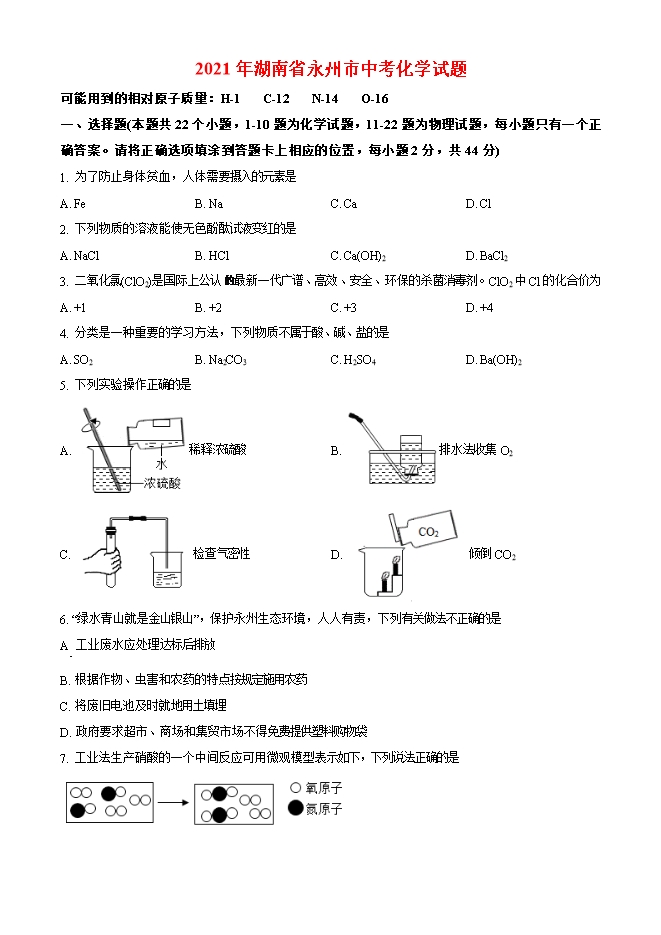 【内容简介】一、选择题(本题共22个小题,1-10题为化学试题,11-22题为物理试题,每小题只有一个正确答案。请将正确选项填涂到答题卡上相应的位置,每小题2分,共44分)1. 为了防止身体贫血,人体需要摄入的元素是A. Fe B. Na C. Ca D. Cl2. 下列物质的溶液能使无色酚酞试液变红的是A. NaCl B. HCl C. Ca(OH)2 D. BaCl23. 二氧化氯(ClO2)是国际上公认 最新一代广谱、高效、安全、环保的杀菌消毒剂。ClO2中Cl的化合价为A. +1 B. +2 C. +3 D. +44. 分类是一种重要的学习方法,下列物质不属于酸、碱、盐的是A. SO2 B. Na2CO3 C. H2SO4 D. Ba(OH)25. 下列实验操作正确的是A. 稀释浓硫酸 B. 排水法收集O2C. 检查气密性 D. 倾倒CO26. “绿水青山就是金山银山”,保护永州生态环境,人人有责,下列有关做法不正确的是A 工业废水应处理达标后排放B. 根据作物、虫害和农药的特点按规定施用农药C. 将废旧电池及时就地用土填埋D. 政府要求超市、商场和集贸市场不得免费提供塑料购物袋7. 工业法生产硝酸的一个中间反应可用微观模型表示如下,下列说法正确的是......