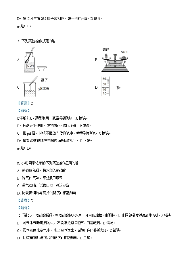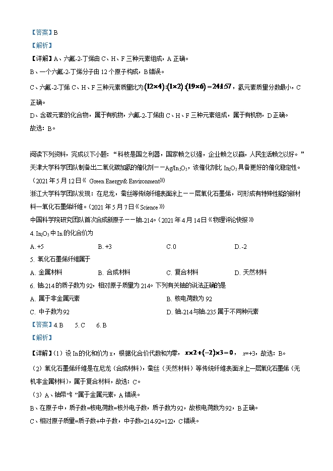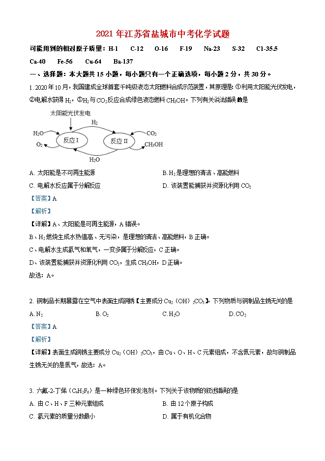 【内容简介】一、选择题:本大题共15小题,每小题只有一个正确选项,每小题2分,共30分。1. 2020年10月,我国建成全球首套千吨级液态太阳燃料合成示范装置,其原理是:①利用太阳能光伏发电,②电解水获得H2,③H2与CO2反应合成绿色液态燃料CH3OH。下列有关说法错误 是 A. 太阳能是不可再生能源 B. H2是理想的清洁、高能燃料C. 电解水反应属于分解反应 D. 该装置能捕获并资源化利用CO2【答案】A【解析】【详解】A、太阳能是可再生能源,A错误。B、H2燃烧生成水热值高、无污染,是理想的清洁、高能燃料,B正确。C、电解水生成氢气和氧气,一变多属于分解反应,C正确。D、该装置能捕获并资源化利用CO2,生成CH3OH,D正确。故选:A。2. 铜制品长期暴露在空气中表面生成铜锈【主要成分Cu2(OH)2CO3】,下列物质与铜制品生锈无关的是A. N2 B. O2 C. H2O D. CO2【答案】A【解析】【详解】表面生成铜锈主要成分Cu2(OH)2CO3,由Cu、O、H、C元素组成,不含氮元素,故与铜制品生锈无关的是氮气,故选:A。3. 六氟-2-丁烯(C4H2F6)是一种绿色环保发泡剂。下列关于该物质的叙述错误的是A. 由C、H、F三种元素组成 B. 由12个原子构成C. 氢元素的质量分数最小 D. 属于有机化合物【答案】B【解析】【详解】A、六氟-2-丁烯由C、H、F三种元素组成,A正确。B、一个六氟-2-丁烯分子由12个原子构成,B错误。C、六氟-2-丁烯C、H、F三种元素质量比为 ,氢元素质量分数最小,C正确。......