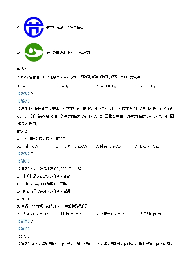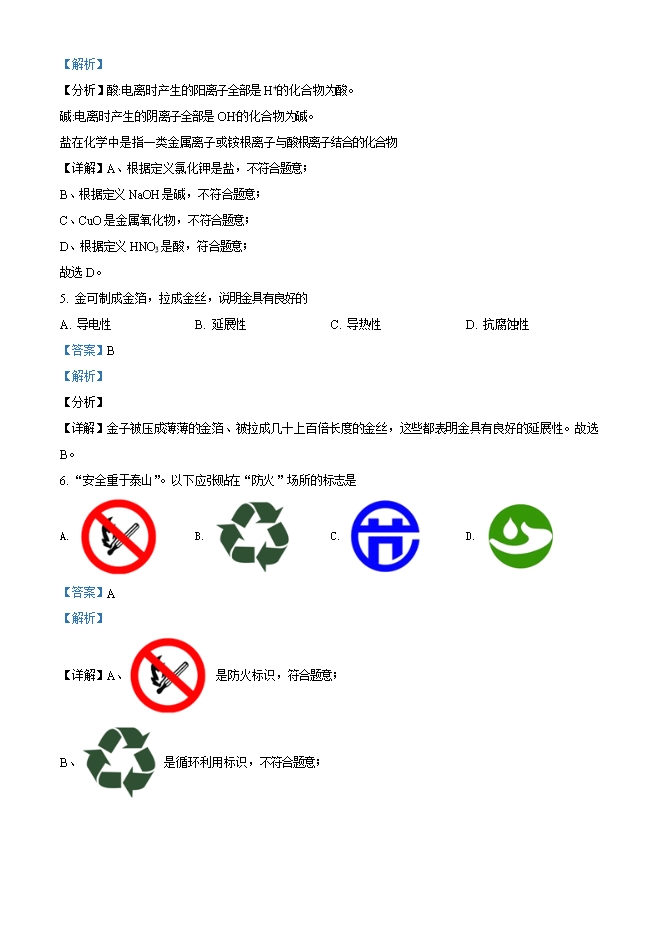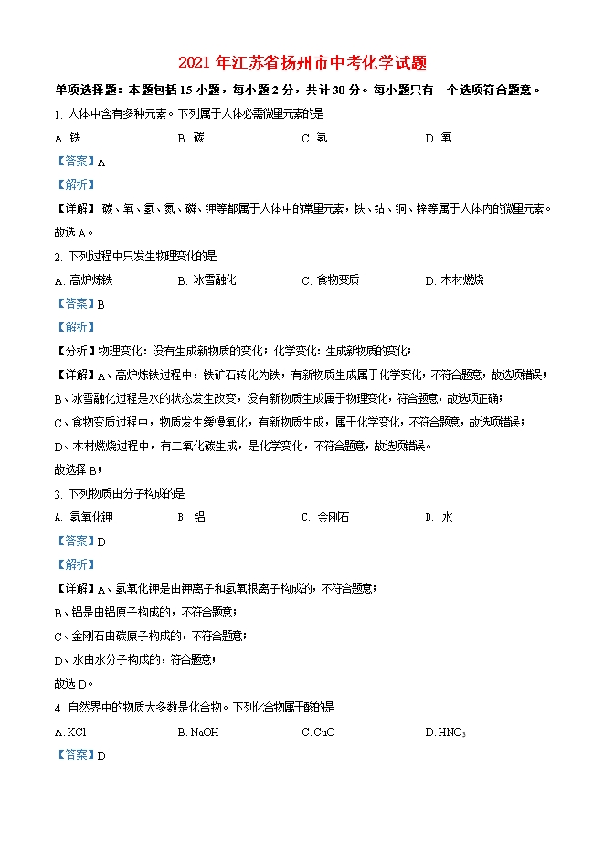 【内容简介】1. 人体中含有多种元素。下列属于人体必需微量元素的是A. 铁 B. 碳 C. 氢 D. 氧【答案】A【解析】【详解】 碳、氧、氢、氮、磷、钾等都属于人体中的常量元素,铁、钴、铜、锌等属于人体内的微量元素。故选A。2. 下列过程中只发生物理变化的是A. 高炉炼铁 B. 冰雪融化 C. 食物变质 D. 木材燃烧【答案】B【解析】【分析】物理变化:没有生成新物质的变化;化学变化:生成新物质的变化;【详解】A、高炉炼铁过程中,铁矿石转化为铁,有新物质生成属于化学变化,不符合题意,故选项错误;B、冰雪融化过程是水的状态发生改变,没有新物质生成属于物理变化,符合题意,故选项正确;C、食物变质过程中,物质发生缓慢氧化,有新物质生成,属于化学变化,不符合题意,故选项错误;D、木材燃烧过程中,有二氧化碳生成,是化学变化,不符合题意,故选项错误。故选择B;3. 下列物质由分子构成的是A. 氢氧化钾 B. 铝 C. 金刚石 D. 水【答案】D【解析】【详解】A、氢氧化钾是由钾离子和氢氧根离子构成的,不符合题意;B、铝是由铝原子构成的,不符合题意;C、金刚石由碳原子构成的,不符合题意;D、水由水分子构成的,符合题意;故选D。4. 自然界中的物质大多数是化合物。下列化合物属于酸的是A. KCl B. NaOH C. CuO D. HNO3【答案】D【解析】【分析】酸:电离时产生的阳离子全部是H+的化合物为酸。碱:电离时产生的阴离子全部是OH-的化合物为碱。盐在化学中是指一类金属离子或铵根离子与酸根离子结合的化合物......