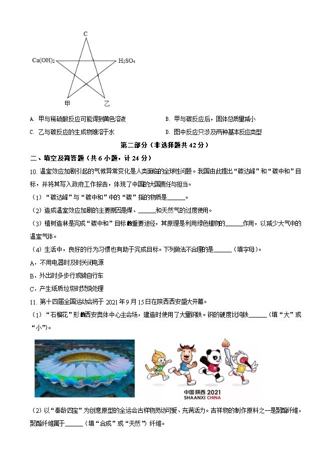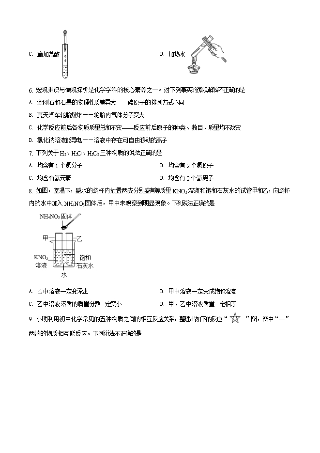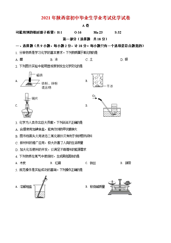 【内容简介】一、选择题(共9小题,每小题2分,计18分。每小题只有一个选项是符合题意的)1. 分辨物质是学习化学的基本要求。下列物质属于氧化物的是A. 醋 B. 冰 C. 土 D. 银2. 下列图示实验中能明显观察到发生化学变化的是A. B. C. D. 3. 化学为人类作出巨大贡献。下列说法不正确的是A. 合理使用加碘食盐,能有效预防甲状腺肿大B. 图书档案失火用液态二氧化碳扑灭有利于保护图书资料C. 新材料的推广应用,极大改善了人类的生活质量D. 加大化石燃料的开发,以满足不断增长的能源需求4. 下列物质在氧气中燃烧时,生成黑色固体的是A. 木炭 B. 红磷 C. 铁丝 D. 镁带5. 规范操作是实验成功的基础。下列操作正确的是......