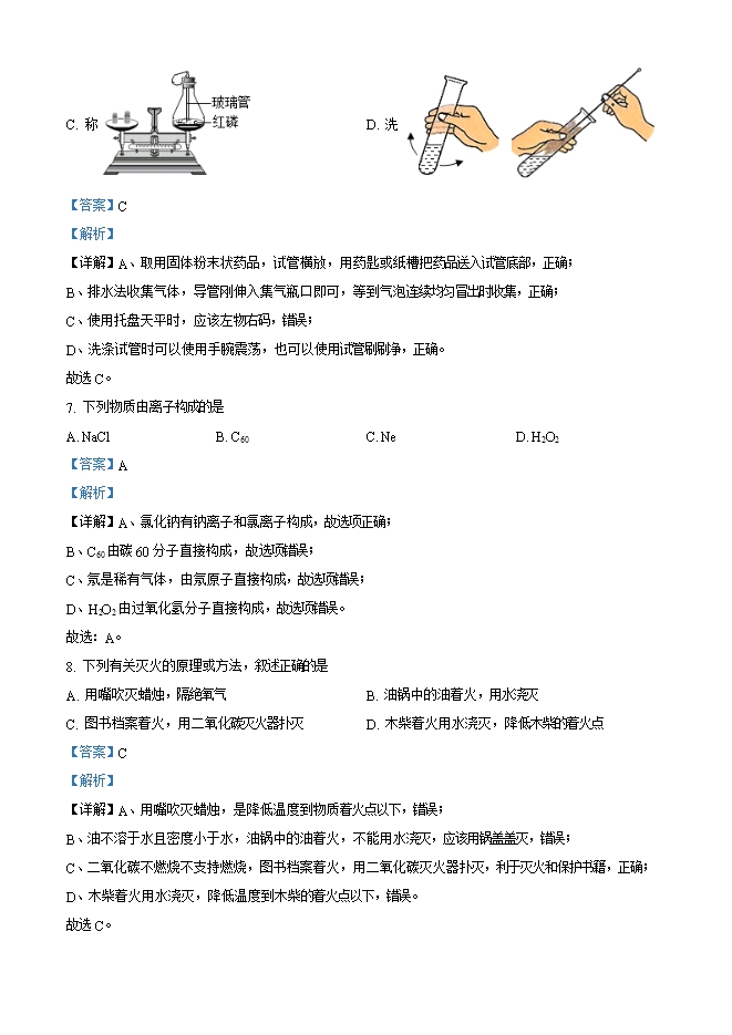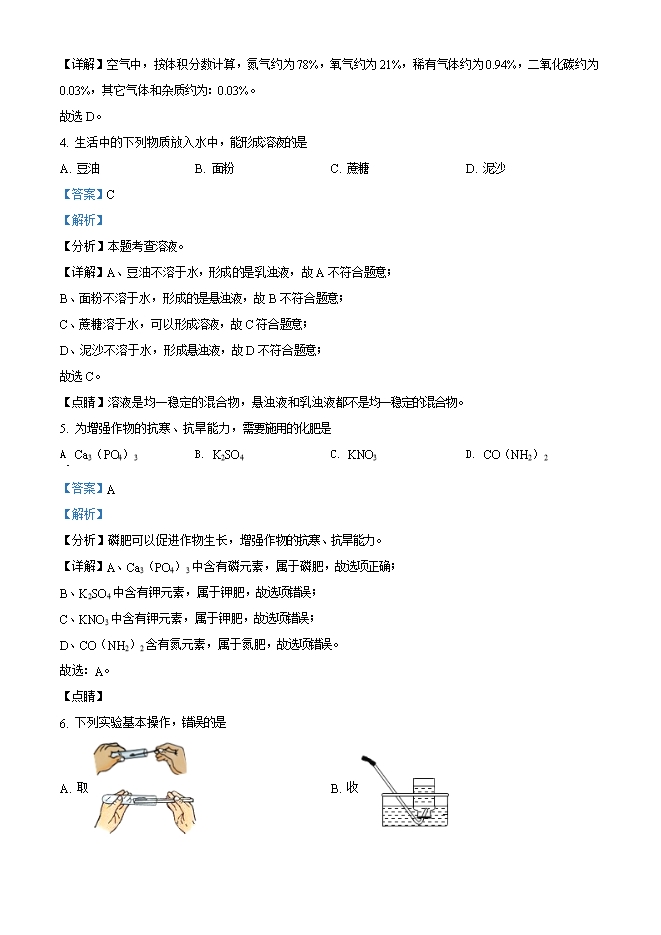 【内容简介】一、选择题(本题包括15个小题,共20分,每小题只有一个选项符合题意,第一小题~第10小题,每题1分;第11小题~第15小题,每小题2分)1. 下列变化属于物理变化 是A. 海水晒盐 B. 葡萄酿酒 C. 燃放礼花 D. 冶炼金属【答案】A【解析】【详解】A、海水晒盐是一个蒸发结晶过程,没有生成新物质,物理变化;B、葡萄酿酒生成了新物质酒精,化学变化;C、燃放礼花发生燃烧爆炸,生成了新物质,化学变化;D、冶炼金属生成新物质金属,化学变化。故选A。2. 为预防青少年成长过程中食欲不振,生长迟缓,发育不良,需适量补充的元素是A. 碘 B. 铁 C. 钙 D. 锌【答案】D【解析】【详解】A、人体缺碘会引起甲状腺肿大,此选项不正确;B、人体缺铁会引起贫血,此选项不正确;C、人体缺钙易会引起骨质疏松,此选项不正确;D、人体缺锌会引起食欲不振,生长迟缓,发育不良,此选项正确。故选D。3. 空气中,稀有气体的体积分数约为A. 0.03% B. 78% C. 21% D. 0.94%【答案】D【解析】......