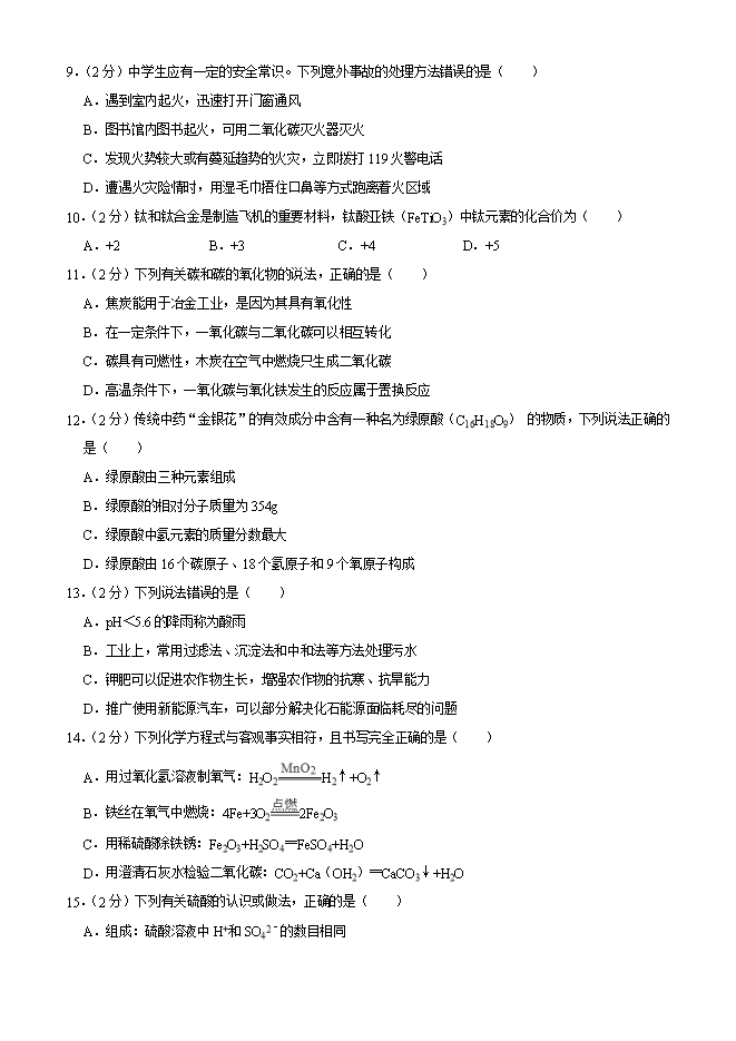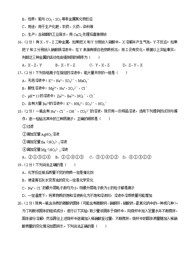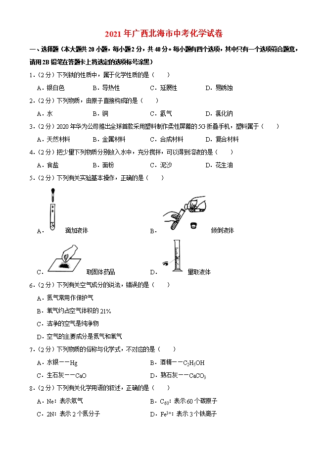 【内容简介】一、选择题(本大题共20小题,每小题2分,共40分。每小题有四个选项,其中只有一个选项符合题意,请用2B铅笔在答题卡上将选定的选项标号涂黑)1.(2分)下列铁的性质中,属于化学性质的是( )A.银白色 B.导热性 C.延展性 D.易锈蚀2.(2分)下列物质,由原子直接构成的是( )A.水 B.铜 C.氢气 D.氯化钠3.(2分)2020年华为公司推出全球首款采用塑料制作柔性屏幕的5G折叠手机,塑料属于( )A.天然材料 B.金属材料 C.合成材料 D.复合材料4.(2分)把少量下列物质分别放入水中,充分搅拌,可以得到溶液的是( )A.食盐 B.面粉 C.泥沙 D.花生油5.(2分)下列有关实验基本操作,正确的是( )......
