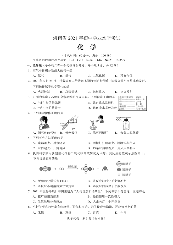 【内容简介】2021年海南省中考化学真题(PDF版含答案)