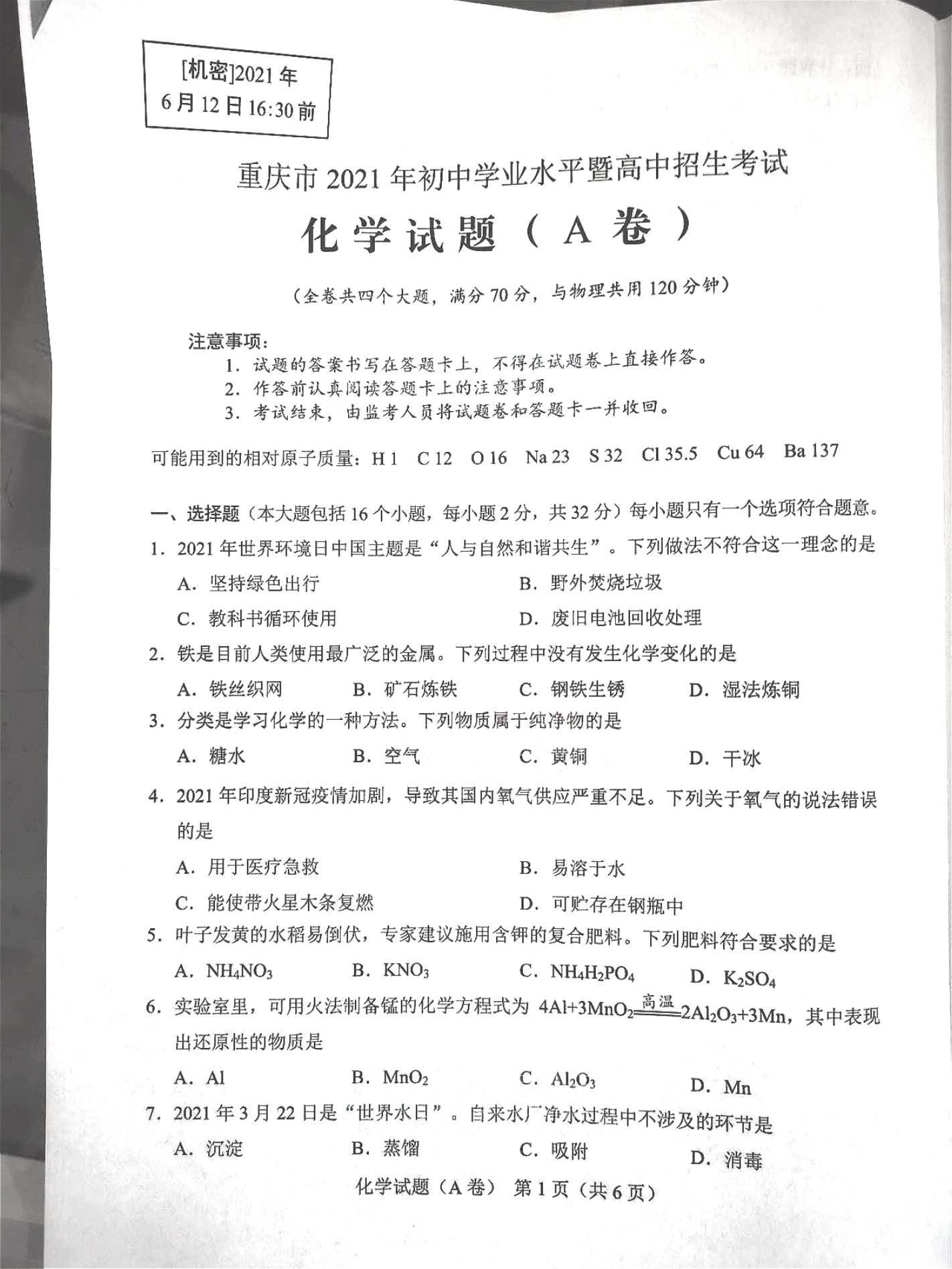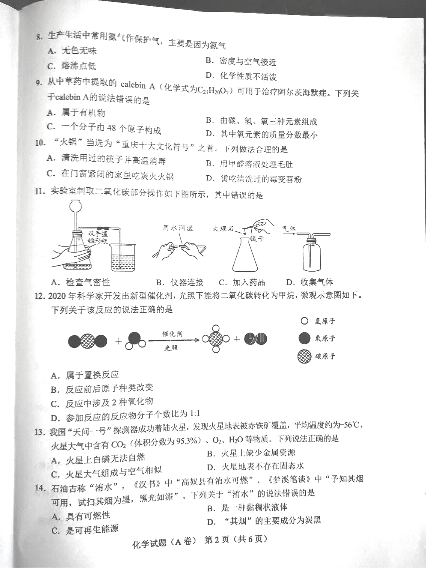 2021年重庆市中考化学试题A卷(PDF版含答案)