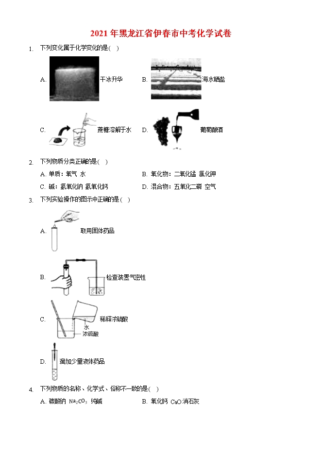 2021年黑龙江省伊春市中考化学试题(word版,含答案解析)