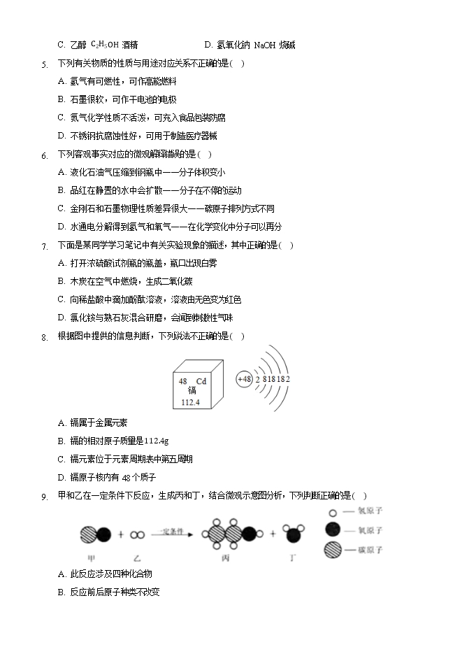 【内容简介】 下列物质分类正确的是( )A. 单质:氧气 水 B. 氧化物:二氧化锰 氯化钾C. 碱:氢氧化钠 氢氧化钙 D. 混合物:五氧化二磷 空气 下列实验操作的图示中正确的是( )A. 取用固体药品B. 检查装置气密性C. 稀释浓硫酸D. 滴加少量液体药品 下列物质的名称、化学式、俗称不一致的是( )A. 碳酸钠 Na_2 CO_3 纯碱 B. 氧化钙 CaO 消石灰C. 乙醇 C_2 H_5 OH 酒精 D. 氢氧化钠 NaOH 烧碱 下列有关物质的性质与用途对应关系不正确的是( )A. 氢气有可燃性,可作高能燃料B. 石墨很软,可作干电池的电极C. 氮气化学性质不活泼,可充入食品包装防腐D. 不锈钢抗腐蚀性好,可用于制造医疗器械 下列客观事实对应的微观解释错误的是( )A. 液化石油气压缩到钢瓶中一一分子体积变小B. 品红在静置的水中会扩散一一分子在不停的运动C. 金刚石和石墨物理性质差异很大一一碳原子排列方式不同D. 水通电分解得到氢气和氧气一一在化学变化中分子可以再分......