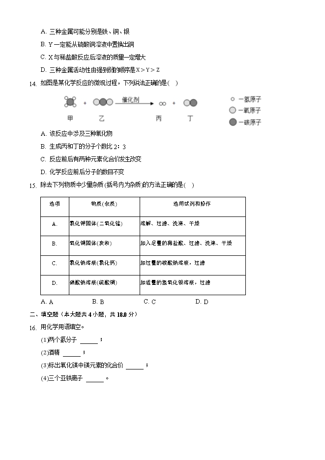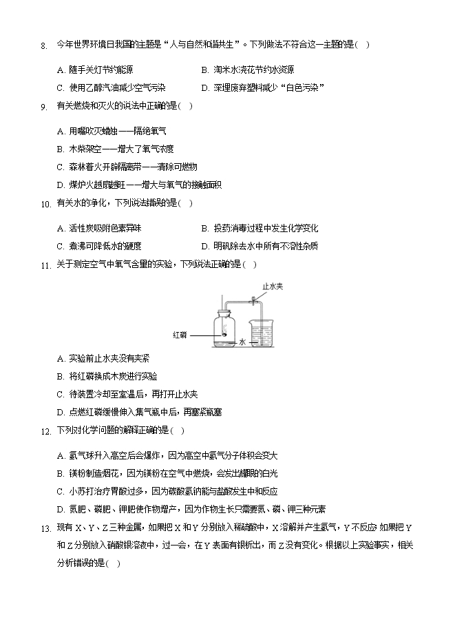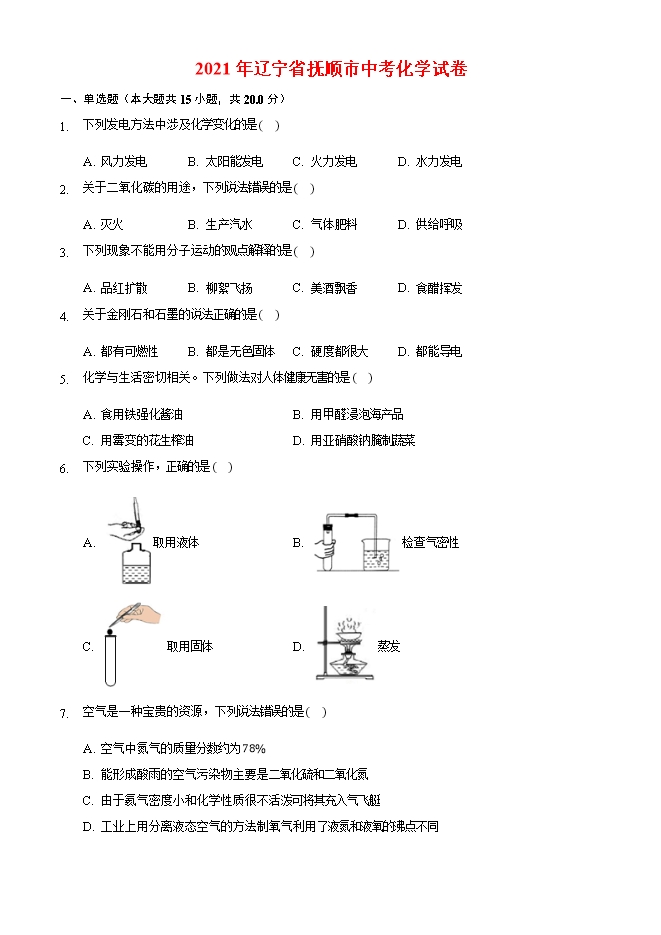 【内容简介】一、单选题(本大题共15小题,共20.0分) 下列发电方法中涉及化学变化的是( )A. 风力发电 B. 太阳能发电 C. 火力发电 D. 水力发电 关于二氧化碳的用途,下列说法错误的是( )A. 灭火 B. 生产汽水 C. 气体肥料 D. 供给呼吸 下列现象不能用分子运动的观点解释的是( )A. 品红扩散 B. 柳絮飞扬 C. 美酒飘香 D. 食醋挥发 关于金刚石和石墨的说法正确的是( )A. 都有可燃性 B. 都是无色固体 C. 硬度都很大 D. 都能导电 化学与生活密切相关。下列做法对人体健康无害的是( )A. 食用铁强化酱油 B. 用甲醛浸泡海产品 _ _ C. 用霉变的花生榨油 D. 用亚硝酸钠腌制蔬菜 下列实验操作,正确的是( )......