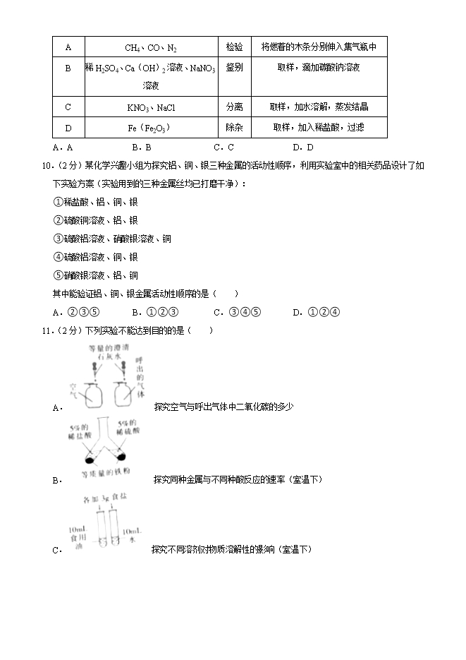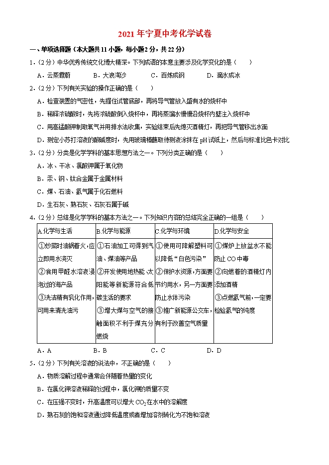 【内容简介】一、单项选择题(本大题共11小题,每小题2分,共22分)1.(2分)中华优秀传统文化博大精深。下列成语的本意主要涉及化学变化的是( )A.云蒸霞蔚 B.大浪淘沙 C.百炼成钢 D.滴水成冰2.(2分)下列有关实验的操作正确的是( )A.检查装置的气密性,先握住试管底部,再将导气管放入盛有水的烧杯中 B.稀释浓硫酸时,先将浓硫酸倒入烧杯中,再将蒸馏水慢慢沿烧杯内壁注入烧杯中 C.用高锰酸钾制取氧气并用排水法收集,实验结束后先熄灭酒精灯,再把导气管移出水面 D.测定小苏打溶液的酸碱度时,先用玻璃棒蘸取待测液涂抹在pH试纸上,然后与标准比色卡对比3.(2分)分类是化学学科的基本思想方法之一。下列分类正确的是( )A.冰、干冰、氯酸钾属于氧化物 B.汞、钢、钛合金属于金属材料 C.煤、石油、氢气属于化石燃料 D.生石灰、熟石灰、石灰石属于碱4.(2分)总结是化学学科的基本方法之一。下列知识内容的总结完全正确的一组是( ) A.化学与生活 B.化学与能源 C.化学与环境 D.化学与安全①炒菜时油锅着火,应立即用水浇灭②食用甲醛水溶液浸泡过的海产品③洗洁精有乳化作用,可用来清洗油污 ①石油加工可得到汽油、煤油等产品②开发使用地热能、太阳能等新能源符合低碳生活的要求③增大煤与空气的接触面积不利于煤充分燃烧 ①使用可降解塑料可以降低“白色污染”②保护水资源,方面要节约用水,另一方面要防止水体污染③推广新能源公交车,有利于改善空气质量 ①煤炉上放盆水不能防止CO中毒②向燃着的酒精灯内添加酒精③点燃氢气前,一定要检验氢气的纯度A.A B.B C.C D.D5.(2分)下列有关溶液的说法中,不正确的是( )A.物质溶解过程中通常会伴随着热量的变化 B.在氯化钾溶液稀释的过程中,氯化钾的质量不变 C.在压强不变时,升高温度可以增大CO2在水中的溶解度 D.熟石灰的饱和溶液通过降低温度或者增加溶剂转化为不饱和溶液......