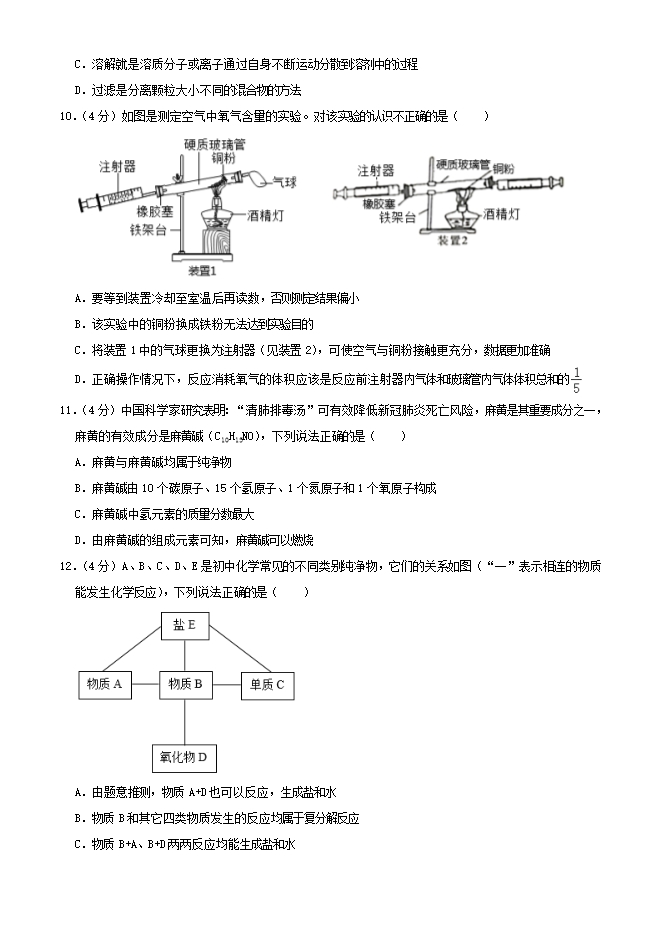 【内容简介】一、选择题(本题包括12小题,共40分。1至8题每小题3分,9至12题每小题3分。每小题只有一个选项符合题意)1.东营市“小蓝桶”助力垃圾分类进校园项目正在推广。下列垃圾不能投放到可回收物垃圾桶内的是( )A.废口罩 B.塑料矿泉水瓶 C.废纸 D.铝制饮料罐2.下列判断错误的是( )A.NaOH固体有吸水性﹣﹣物理性质 B.NaOH固体为白色片状﹣﹣物理性质 C.NaOH固体溶于水得到的溶液显碱性﹣﹣物理性质 D.NaOH固体放在空气中易变质﹣﹣化学性质3.下列实验操作正确的是( )A.倾倒液体 B. 滴加液体 C. 熄灭酒精灯 D. 稀释浓硫酸4.“碳中和”是指一定时间内排放的碳总量与吸收的碳总量相互抵消,实现碳“零排放”,下列有关碳循环、碳中和的说法,错误的是( )A.每个人都在参与碳循环,碳循环中的“碳”是指碳单质 B.开发可再生能源,降低化石燃料的需求量,以控制二氧化碳排放量 C.大力植树造林,严禁乱砍滥伐森林,以控制二氧化碳排放量 D.碳中和能有效维持碳循环的相对稳定,控制日趋严重的温室效应5.火药是我国的四大发明之一,已知黑火药爆炸的化学方程式为:S+2KNO3+3C K2S+N2↑+3CO2↑,此反应涉及到的化学用语表示方法正确的是( )A.硝酸钾中的硝酸根离子:NO31﹣ ......