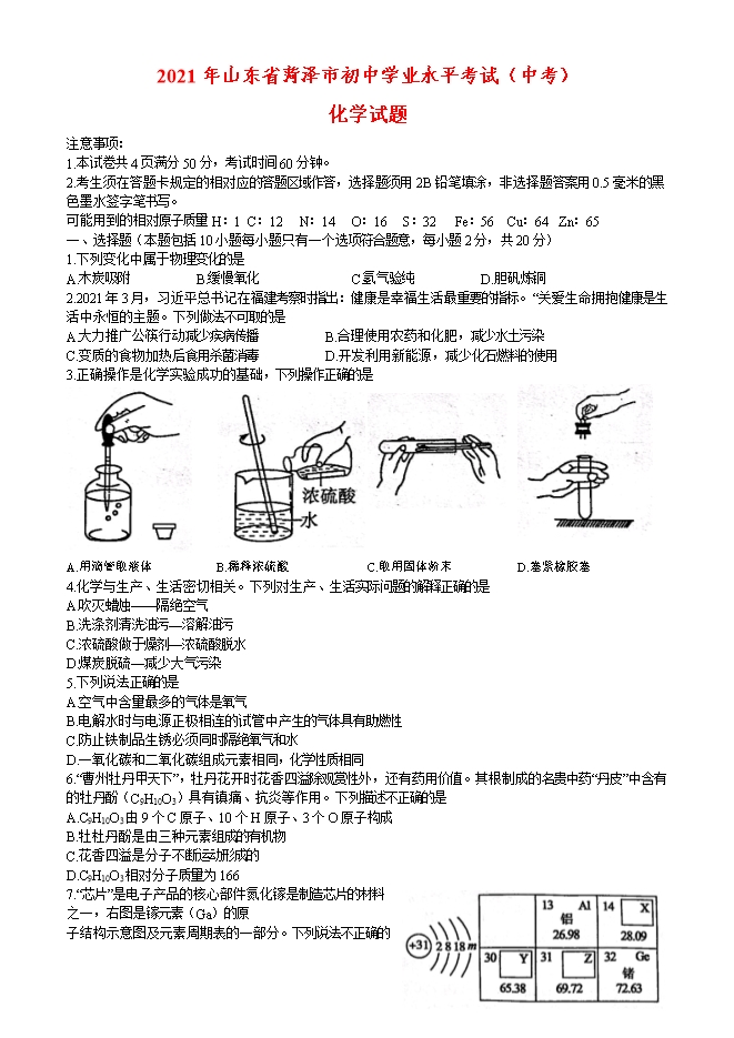 【内容简介】一、选择题(本题包括10小题每小题只有一个选项符合题意,每小题2分,共20分)1.下列变化中属于物理变化的是A.木炭吸附 B.缓慢氧化 C.氢气验纯 D.胆矾炼铜2.2021年3月,习近平总书记在福建考察时指出:健康是幸福生活最重要的指标。“关爱生命拥抱健康是生活中永恒的主题。下列做法不可取的是A.大力推广公筷行动减少疾病传播 B.合理使用农药和化肥,减少水土污染C.变质的食物加热后食用杀菌消毒 D.开发利用新能源,减少化石燃料的使用3.正确操作是化学实验成功的基础,下列操作正确的是 A.用滴管取液体 B.稀释浓硫酸 C.取用固体粉末 D.塞紧橡胶塞4.化学与生产、生活密切相关。下列对生产、生活实际问题的解释正确的是A.吹灭蜡烛——隔绝空气B.洗涤剂清洗油污—溶解油污C.浓硫酸做于燥剂—浓硫酸脱水D.煤炭脱硫—减少大气污染5.下列说法正确的是A.空气中含量最多的气体是氧气B.电解水时与电源正极相连的试管中产生的气体具有助燃性C.防止铁制品生锈必须同时隔绝氧气和水D.一氧化碳和二氧化碳组成元素相同,化学性质相同6.“曹州牡丹甲天下”,牡丹花开时花香四溢除观赏性外,还有药用价值。其根制成的名贵中药“丹皮”中含有的牡丹酚(C9H10O3)具有镇痛、抗炎等作用。下列描述不正确的是A.C9H10O3由9个C原子、10个H原子、3个O原子构成B.牡杜丹酚是由三种元素组成的有机物C.花香四溢是分子不断运动形成的D.C9H10O3相对分子质量为1667.“芯片”是电子产品的核心部件氮化镓是制造芯片的材料之一,右图是镓元素(Ga)的原子结构示意图及元素周期表的一部分。下列说法不正确的......