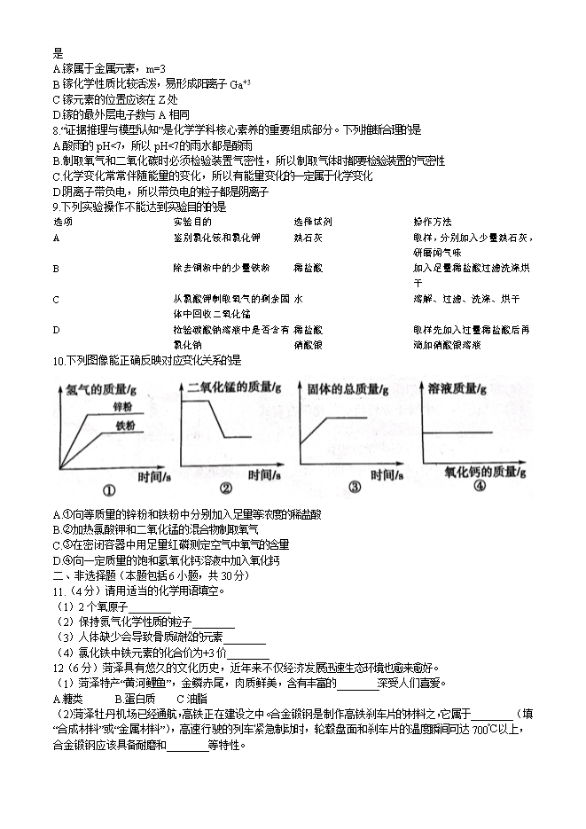2021年山东省菏泽市中考化学试题(word版含答案)