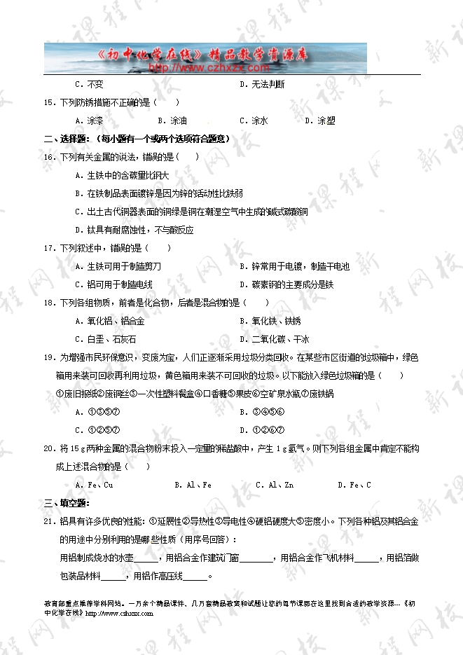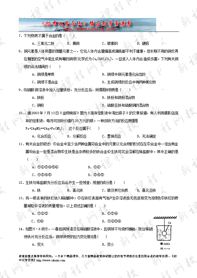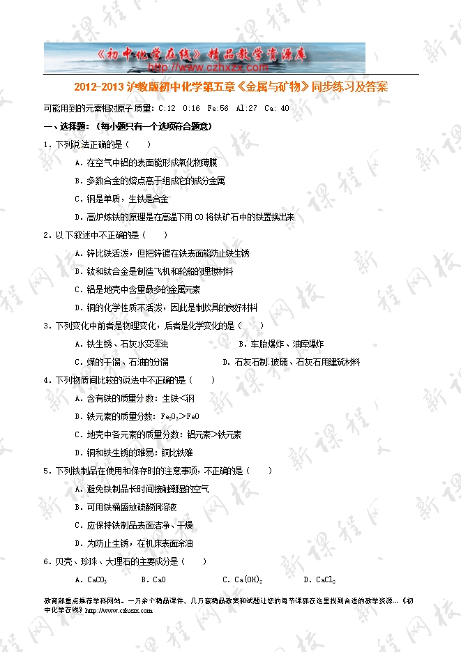 2012-2013沪教版初中化学第五章《金属的冶炼与利用》同步练习及答案