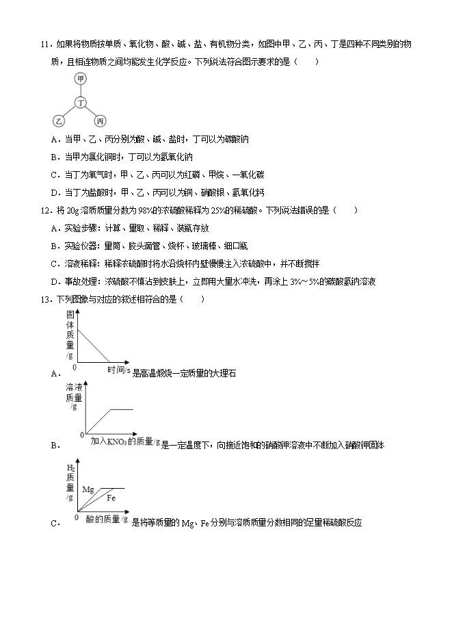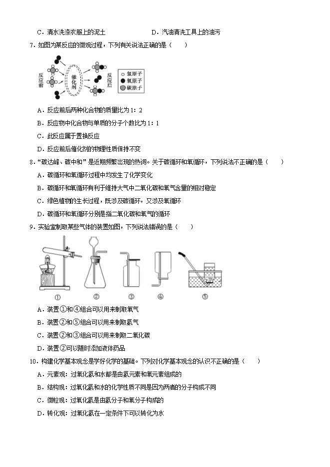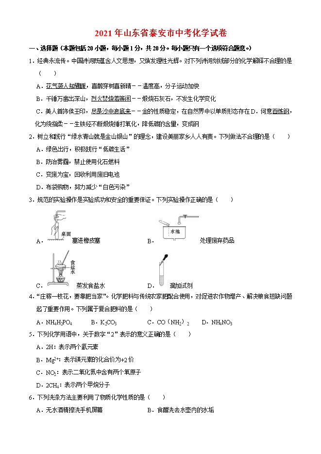 【内容简介】1.经典永流传。中国诗词既蕴含人文思想,又焕发理性光辉。对下列诗词划线部分的化学解释不合理的是( )A.花气袭人知骤暖,喜鹊穿树喜新晴﹣﹣温度高,分子运动加快 B.千锤万凿出深山,烈火焚烧若等闲﹣﹣煅烧石灰石,不发生化学变化 C.美人首饰侯王印,尽是沙中浪底来﹣﹣金的性质稳定,在自然界中以单质形态存在D.何意百炼钢,化为绕指柔﹣﹣生铁经不断煅烧捶打氧化,降低碳的含量,变成钢2.树立和践行“绿水青山就是金山银山”的理念,建设美丽家乡人人有责。下列做法不合理的是( )A.绿色出行,积极践行“低碳生活” B.防治雾霾,禁止使用化石燃料 C.变废为宝,回收利用废旧电池 D.布袋购物,努力减少“白色污染”3.规范的实验操作是实验成功和安全的重要保证。下列实验操作正确的是( )......