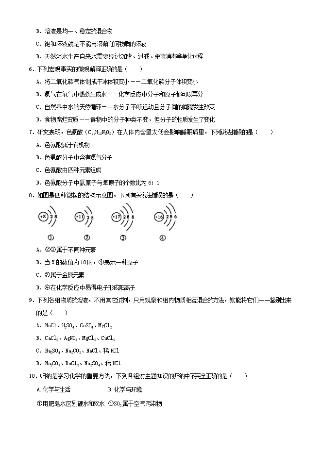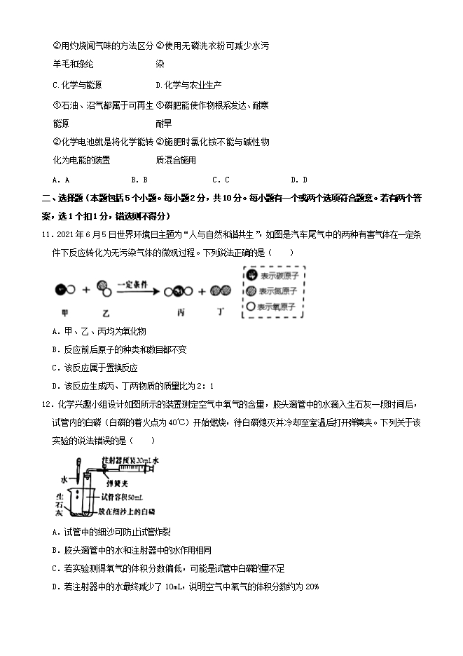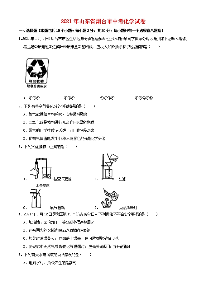 【内容简介】1.2021年1月1日《烟台市市区生活垃圾分类管理办法》正式实施。某同学做家务时收集到如下垃圾:①铝制易拉罐②废电池③烂菜叶④废纸盒⑤塑料瓶,应投入如图所示标识垃圾箱的是( ) A.①②④ B.①④⑤ C.①②④⑤ D.①②③④⑤2.下列有关空气各成分的说法错误的是( )A.氧气能供给生物呼吸,支持燃料燃烧 B.二氧化碳是植物进行光合作用必需的物质 C.氮气的化学性质不活泼,可用作食品防腐 D.稀有气体通电发出各种不同颜色的光是化学变化3.下列实验操作中正确的是( )A. 检查气密性 B. 过滤 C. 氧气验满 D. 点燃酒精灯4.2021年5月12日足我国第13个防灾减灾日。下列做法不符合安全要求的是( )A.加油站、面粉加工厂等场所必须严禁烟火 B.在有明火的区域内喷洒含酒精的消毒剂 C.炒菜时油锅着火,立即盖上锅盖,使可燃物隔绝气而灭火 D.发现家中天然气或者液化气泄漏时,应先关闭阀门,并开窗通风5.下列有关水与溶液的说法错误的是( )A.电解水时,负极产生的是氢气 B.溶液是均一、稳定的混合物 C.饱和溶液就是不能再溶解任何物质的溶液 D.天然淡水生产自来水需要经过沉降、过滤、杀菌消毒等净化过程6.下列宏观事实的微观解释正确的是( )A.将二氧化碳气体制成干冰体积变小——二氧化碳分子体积变小 ......
