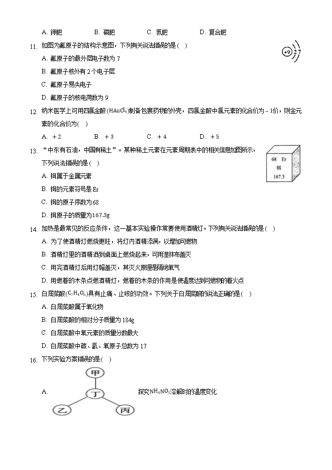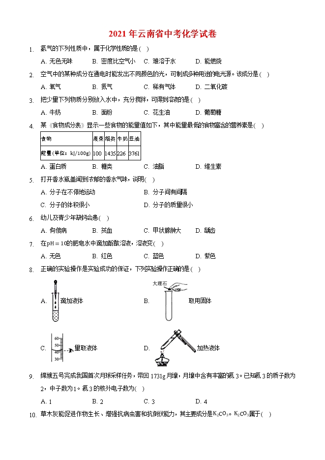 【内容简介】 氢气的下列性质中,属于化学性质的是( )A. 无色无味 B. 密度比空气小 C. 难溶于水 D. 能燃烧 空气中的某种成分在通电时能发出不同颜色的光,可制成多种用途的电光源。该成分是( )A. 氧气 B. 氮气 C. 稀有气体 D. 二氧化碳 把少量下列物质分别放入水中,充分搅拌,可得到溶液的是( )A. 牛奶 B. 面粉 C. 花生油 D. 葡萄糖 某《食物成分表》显示一些食物的能量值如下,其中能量最低的食物富含的营养素是( ) 食物 菠菜 稻类 牛奶 豆油能量(单位:kJ/100g) 100 1435 226 3761A. 蛋白质 B. 糖类 C. 油脂 D. 维生素 打开香水瓶盖闻到浓郁的香水气味,说明( )A. 分子在不停地运动 B. 分子间有间隔C. 分子的体积很小 D. 分子的质量很小 幼儿及青少年缺钙会患( )A. 佝偻病 B. 贫血 C. 甲状腺肿大 D. 龋齿 在pH=10的肥皂水中滴加酚酞溶液,溶液变( )......