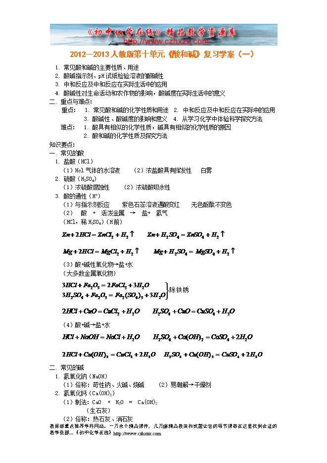 2012--2013人教版第十单元《酸和碱》复习学案(一)