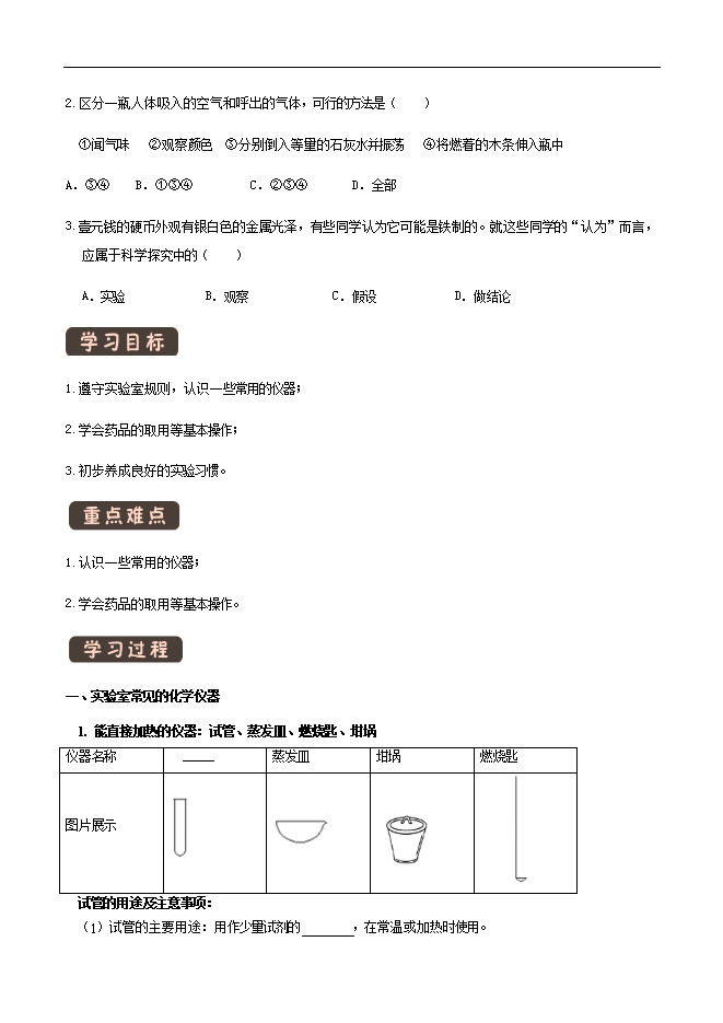 【内容简介】1.下列仪器,既能做反应器皿又能直接加热的是( )A.烧杯 B.集气瓶 C.锥形瓶 D.试管2.下列仪器在加热时要垫上石棉网的是( )A.烧杯 B.试管 C.燃烧匙 D.蒸发皿3.用量筒量取l0mL水,读数时俯视,则所量取水的实际体积( )A.等于10mL B.小于l0mL C.大于l0mL D.无法估汁4.实验室需取用铜片,通常应使用图中所示的仪器是( )A. B. C. D. 5.下列有关药品取用的做法中,正确的是( )A.小李同学将取出后未用完的红磷放回原瓶 B.小明同学品尝了实验室中贴有“蔗糖”标签的药品,表示味道很甜 C.小王同学将剩余药品带出实验室 D.因某固体药品的用量未指明,小白同学取了盖满试管底部的该药品6.下列关于托盘天平的使用不正确的是( )A.称取药品时,药品不能直接放在托盘上 B.称取指定质量的药品时,应先加药品,后加砝码并移动游码至天平平衡 C.称量时观察到指针停在分度盘中央或左右摆动幅度相等时,可认为天平已平衡 D.天平使用完毕,应在天平托盘架下套上橡胶垫7.把碳酸钠粉末装入试管,正确的操作是( )......