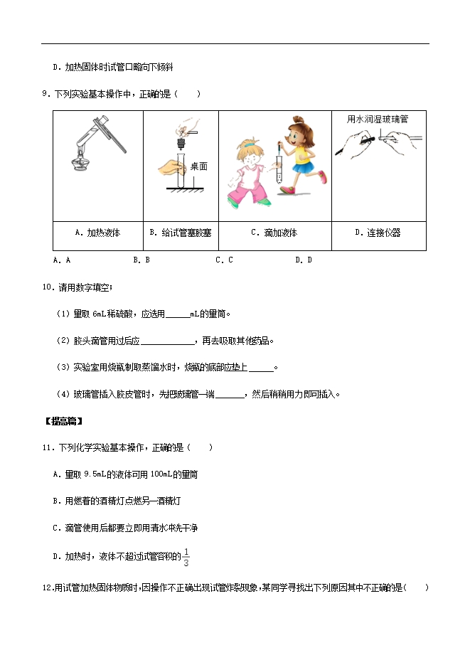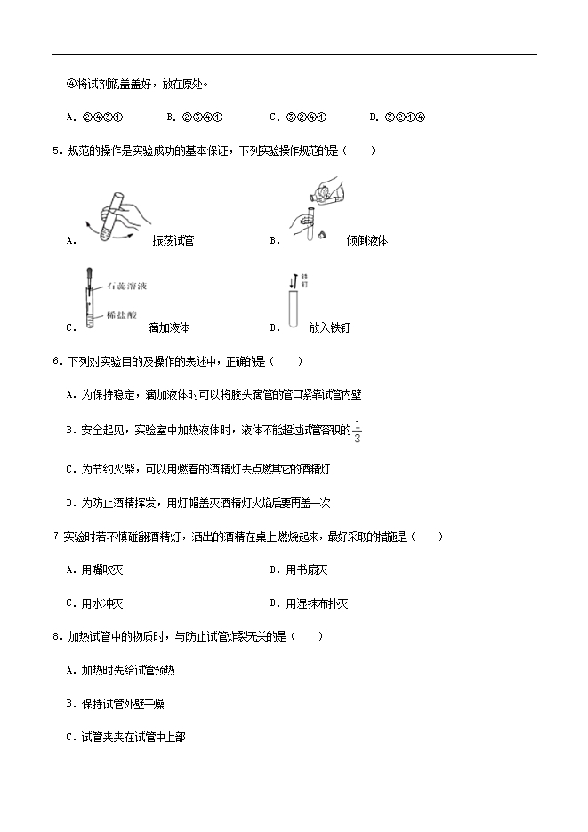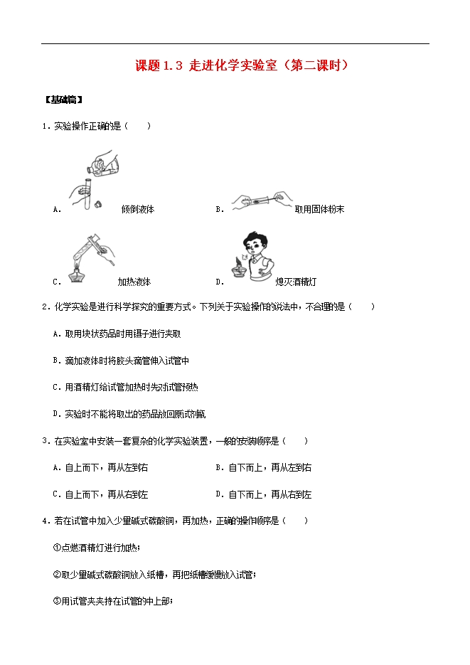 【内容简介】【基础篇】1.实验操作正确的是( )A. 倾倒液体 B. 取用固体粉末 C. 加热液体 D. 熄灭酒精灯2.化学实验是进行科学探究的重要方式。下列关于实验操作的说法中,不合理的是( )A.取用块状药品时用镊子进行夹取 B.滴加液体时将胶头滴管伸入试管中 C.用酒精灯给试管加热时先对试管预热 D.实验时不能将取出的药品放回原试剂瓶3.在实验室中安装一套复杂的化学实验装置,一般的安装顺序是( )A.自上而下,再从左到右 B.自下而上,再从左到右 C.自上而下,再从右到左 D.自下而上,再从右到左4.若在试管中加入少量碱式碳酸铜,再加热,正确的操作顺序是( )①点燃酒精灯进行加热;②取少量碱式碳酸铜放入纸槽,再把纸槽缓慢放入试管;③用试管夹夹持在试管的中上部;④将试剂瓶盖盖好,放在原处。A.②④③① B.②③④① C.③②④① D.③②①④5.规范的操作是实验成功的基本保证,下列实验操作规范的是( )A. 振荡试管 B. 倾倒液体 C. 滴加液体 D. 放入铁钉6.下列对实验目的及操作的表述中,正确的是( )A.为保持稳定,滴加液体时可以将胶头滴管的管口紧靠试管内壁 B.安全起见,实验室中加热液体时,液体不能超过试管容积的 C.为节约火柴,可以用燃着的酒精灯去点燃其它的酒精灯 D.为防止酒精挥发,用灯帽盖灭酒精灯火焰后要再盖一次7.实验时若不慎碰翻酒精灯,洒出的酒精在桌上燃烧起来,最好采取的措施是( )......