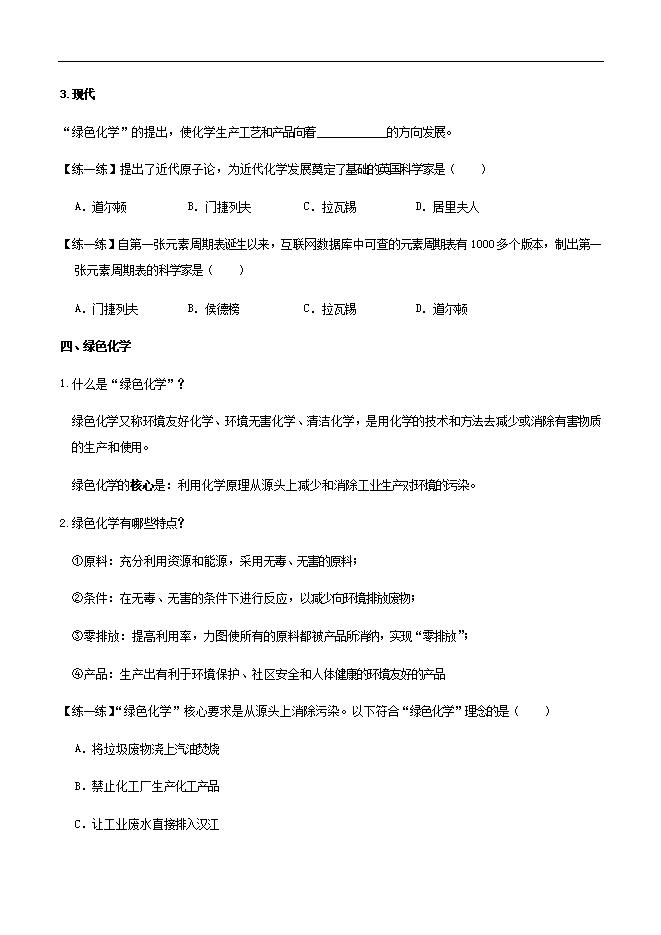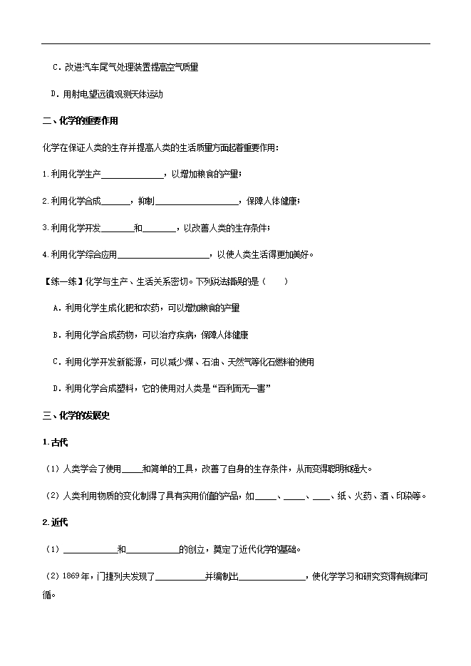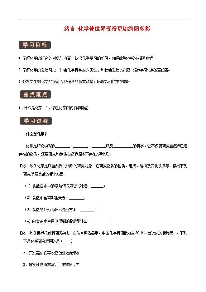 【内容简介】1.了解化学的研究的对象与内容,认识化学学习的价值,知道绿色化学的内容和特点。2.了解化学的发展简史,体会化学科学对人类进步和社会发展的贡献,培养学习化学的责任感。3.激发学生对化学的好奇心及强烈的探究欲望,培养学习化学的兴趣。 1、什么是化学;2、绿色化学的内容和特点 一、什么是化学?化学是研究物质的 、 、 以及 的科学。它不仅要研究自然界已经存在的物质,还要研究和创造自然界原本不存在的新物质。【练一练】化学是以自然界的物质为研究对象,它研究物质的性质、组成、结构及变化规律等.指出下列研究涉及食盐的哪个方面.(1)食盐在水中的溶解情况及它的味道: ;(2)食盐中含有哪些元素: ;(3)食盐的外形为什么是立方体: ;(4)向食盐水中通电得到的物质是什么: .【练一练】世界权威科研类杂志《自然》评估显示,中国化学科研能力在2019年首次成为世界第一,下列不是化学研究范围的是( )A.开发高效低毒农药促进粮食增收 B.研发新物质丰富我们的物质世界 C.改进汽车尾气处理装置提高空气质量 D.用射电望远镜观测天体运动......