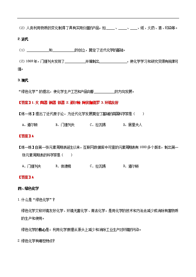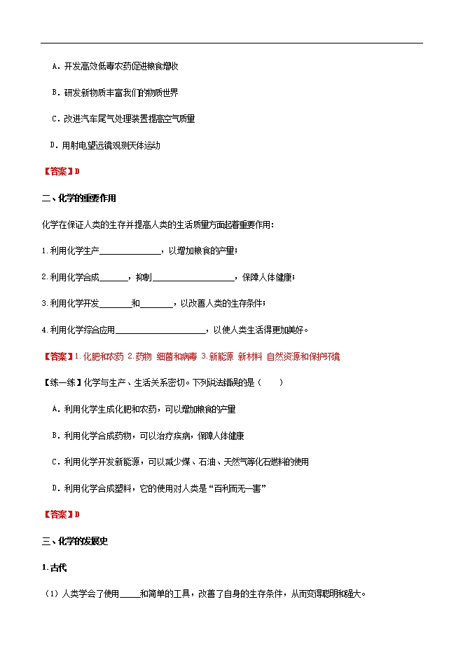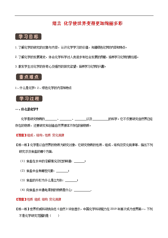 【内容简介】1.了解化学的研究的对象与内容,认识化学学习的价值,知道绿色化学的内容和特点。2.了解化学的发展简史,体会化学科学对人类进步和社会发展的贡献,培养学习化学的责任感。3.激发学生对化学的好奇心及强烈的探究欲望,培养学习化学的兴趣。 1、什么是化学;2、绿色化学的内容和特点 一、什么是化学?化学是研究物质的 、 、 以及 的科学。它不仅要研究自然界已经存在的物质,还要研究和创造自然界原本不存在的新物质。【答案】组成、结构、性质 变化规律【练一练】化学是以自然界的物质为研究对象,它研究物质的性质、组成、结构及变化规律等.指出下列研究涉及食盐的哪个方面.(1)食盐在水中的溶解情况及它的味道: ;(2)食盐中含有哪些元素: ;(3)食盐的外形为什么是立方体: ;(4)向食盐水中通电得到的物质是什么: .【答案】性质 组成 结构 变化规律【练一练】世界权威科研类杂志《自然》评估显示,中国化学科研能力在2019年首次成为世界第一,下列不是化学研究范围的是( )A.开发高效低毒农药促进粮食增收 B.研发新物质丰富我们的物质世界 C.改进汽车尾气处理装置提高空气质量 D.用射电望远镜观测天体运动【答案】D二、化学的重要作用化学在保证人类的生存并提高人类的生活质量方面起着重要作用:1.利用化学生产 ,以增加粮食的产量;2.利用化学合成 ,抑制 ,保障人体健康;3.利用化学开发 和 ,以改善人类的生存条件;4.利用化学综合应用 ,以使人类生活得更加美好。【答案】1.化肥和农药 2.药物 细菌和病毒 3.新能源 新材料 自然资源和保护环境......