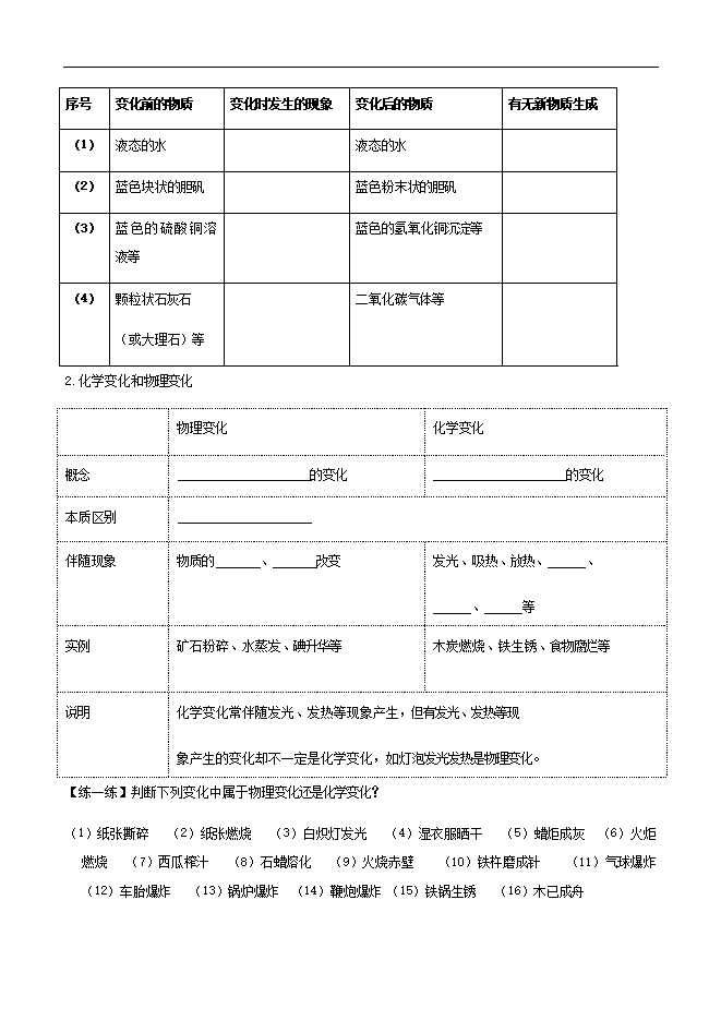 【内容简介】1.化学是研究物质的 、 、 以及 的科学。它不仅要研究自然界已经存在的物质,还要研究和创造自然界原本不存在的新物质。2.(1) 和 的创立,奠定了近代化学的基础。(2)1869年,门捷列夫发现了 并编制出 ,使化学学习和研究变得有规律可循。3.绿色化学的核心是:利用化学原理从 减少和消除工业生产对环境的污染。 1.了解物理变化和化学变化的概念及区别,认识化学变化的基本特征,并能运用概念判断一些易分辨的典型的物理变化和化学变化;2.理解物理性质和化学性质的概念,会区分物质的变化与性质,知道物质性质与用途的关系。3.在实验过程中,引导学生观察化学实验,并进行简单的实验现象的描述,逐步养成良好的学习习惯和方法。 1. 物理变化和化学变化的概念与判断;2. 准确区分物质的性质 一、化学变化和物理变化1.观察实验1-1,记录实验现象序号 变化前的物质 变化时发生的现象 变化后的物质 有无新物质生成(1) 液态的水 液态的水 (2) 蓝色块状的胆矾 蓝色粉末状的胆矾 (3) 蓝色的硫酸铜溶液等 蓝色的氢氧化铜沉淀等 (4) 颗粒状石灰石(或大理石)等 二氧化碳气体等 2.化学变化和物理变化 物理变化 化学变化概念 的变化 的变化本质区别 伴随现象 物质的 、 改变 发光、吸热、放热、 、 、 等实例 矿石粉碎、水蒸发、碘升华等 木炭燃烧、铁生锈、食物腐烂等说明 化学变化常伴随发光、发热等现象产生,但有发光、发热等现象产生的变化却不一定是化学变化,如灯泡发光发热是物理变化。【练一练】判断下列变化中属于物理变化还是化学变化?(1)纸张撕碎 (2)纸张燃烧 (3)白炽灯发光 (4)湿衣服晒干 (5)蜡炬成灰 (6)火炬燃烧 (7)西瓜榨汁 (8)石蜡熔化 (9)火烧赤壁 (10)铁杵磨成针 (11)气球爆炸 (12)车胎爆炸 (13)锅炉爆炸 (14)鞭炮爆炸 (15)铁锅生锈 (16)木已成舟......