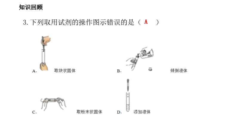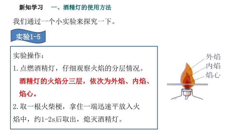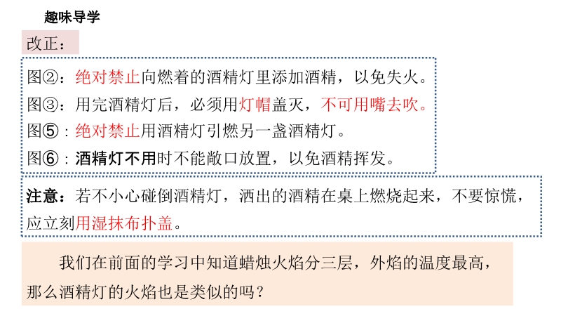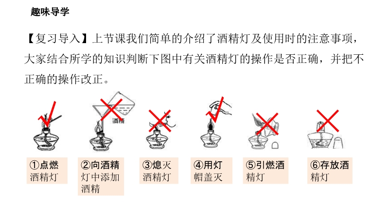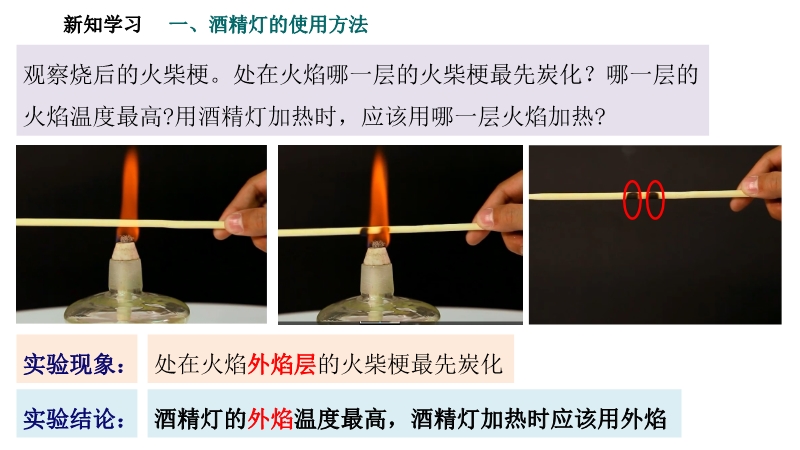 【内容简介】1.下列在实验室中取用药品的做法错误的是( ) A.做完实验后剩余的药品,不能放回原瓶 B.块状固体药品取用时可以用镊子,取用粉末状药品可用药匙或纸槽 C.取用液体药品时,若没说明用量,一般取试管容积的三分之一即可 D.液体药品通常盛放在细口瓶中里,常用倾倒法取用图②:绝对禁止向燃着的酒精灯里添加酒精,以免失火。 图③:用完酒精灯后,必须用灯帽盖灭,不可用嘴去吹。图⑤:绝对禁止用酒精灯引燃另一盏酒精灯。图⑥:酒精灯不用时不能敞口放置,以免酒精挥发。注意:若不小心碰倒酒精灯,洒出的酒精在桌上燃烧起来,不要惊慌,应立刻用湿抹布扑盖我们在前面的学习中知道蜡烛火焰分三层,外焰的温度最高,那么酒精灯的火焰也是类似的吗?观察烧后的火柴梗。处在火焰哪一层的火柴梗最先炭化?哪一层的火焰温度最高?用酒精灯加热时,应该用哪一层火焰加热?......