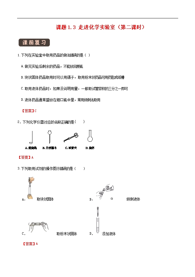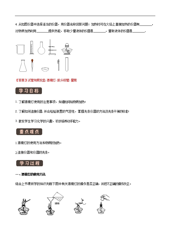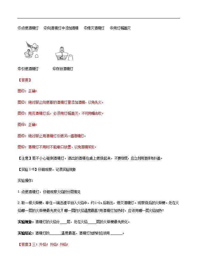 【内容简介】1.下列在实验室中取用药品的做法错误的是( ) A.做完实验后剩余的药品,不能放回原瓶B.块状固体药品取用时可以用镊子,取用粉末状药品可用药匙或纸槽C.取用液体药品时,如果没说明用量,一般取试管容积的三分之一即可D.液体药品通常盛放在细口瓶中里,常用倾倒法取用【答案】C2.下列化学仪器对应的名称正确的是( ) 【答案】A3.下列取用试剂的操作图示错误的是( )A. 取块状固体 B. 倾倒液体 C. 取粉末状固体 D. 添加液体【答案】A4.从如图仪器中选择适当的仪器,用仪器名称回答问题:加热时可在火焰上直接加热的仪器有________,对物质加热时用________提供热能,移取少量液体的仪器是________,量取液体的仪器是________. 【答案】试管和蒸发皿,酒精灯,胶头吸管,量筒 1.了解酒精灯使用的注意事项,知道如何给物质加热;2.了解如何连接仪器,并会检验装置的气密性,掌握洗涤仪器的方法及洗涤干净的标准;3.激发学生学习化学的兴趣,初步培养动手能力。 1.酒精灯的使用方法和物质的加热。2.连接仪器和仪器的洗涤。 一、酒精灯的使用方法结合上节课所学的知识判断下图中有关酒精灯的操作是否正确,并把不正确的操作改正。 ①点燃酒精灯 ②向酒精灯中添加酒精 ③熄灭酒精灯 ④用灯帽盖灭 ⑤引燃酒精灯 ⑥存放酒精灯【答案】图①:正确;图②:绝对禁止向燃着的酒精灯里添加酒精,以免失火。 图③:用完酒精灯后,必须用灯帽盖灭,不可用嘴去吹。图④:正确;图⑤:绝对禁止用酒精灯引燃另一盏酒精灯。图⑥:酒精灯不用时不能敞口放置,以免酒精挥发。【注意】若不小心碰倒酒精灯,洒出的酒精在桌上燃烧起来,不要惊慌,应立刻用湿抹布扑盖。【实验1-5】仔细观察,记录实验现象实验操作:1.点燃酒精灯,仔细观察火焰的分层情况2.取一根火柴梗,拿住一端迅速平放入火焰中,约1-2s后取出,熄灭酒精灯。观察烧后的火柴梗。处在火焰哪一层的火柴梗最先炭化?哪一层的火焰温度最高?用酒精灯加热时,应该用哪一层火焰加热?实验现象:酒精灯的火焰分 层,处在火焰 层的火柴梗最先炭化。实验结论:酒精灯的 温度最高,酒精灯加热时应该用 。【答案】三;外焰;外焰;外焰;......