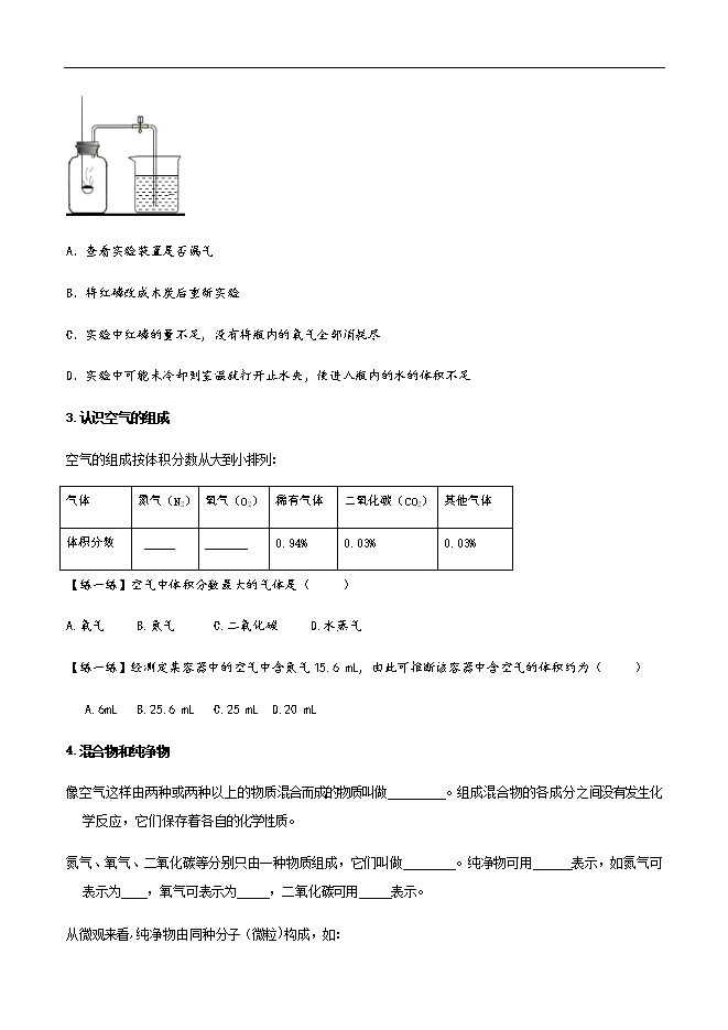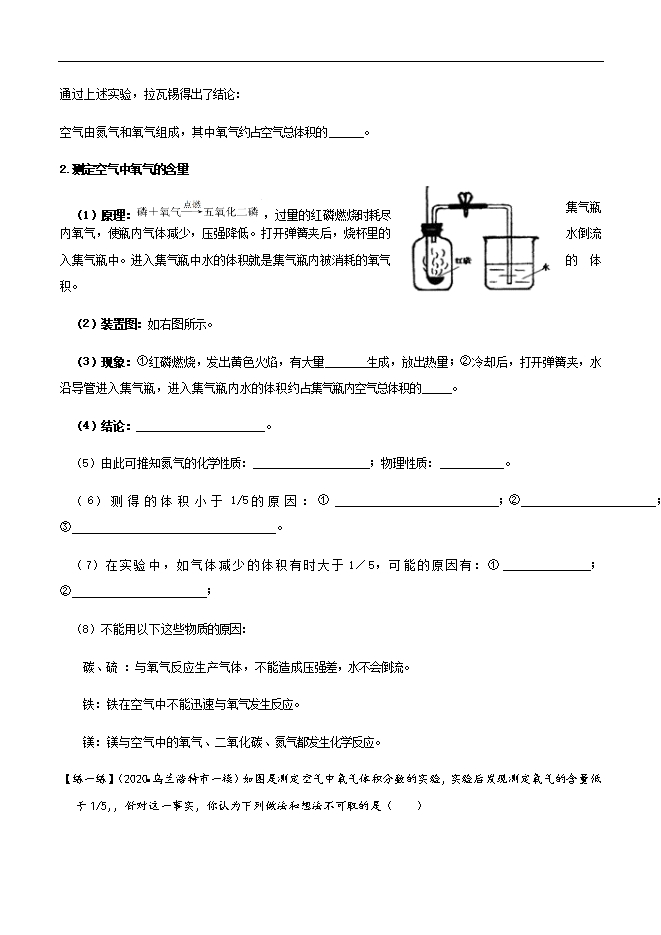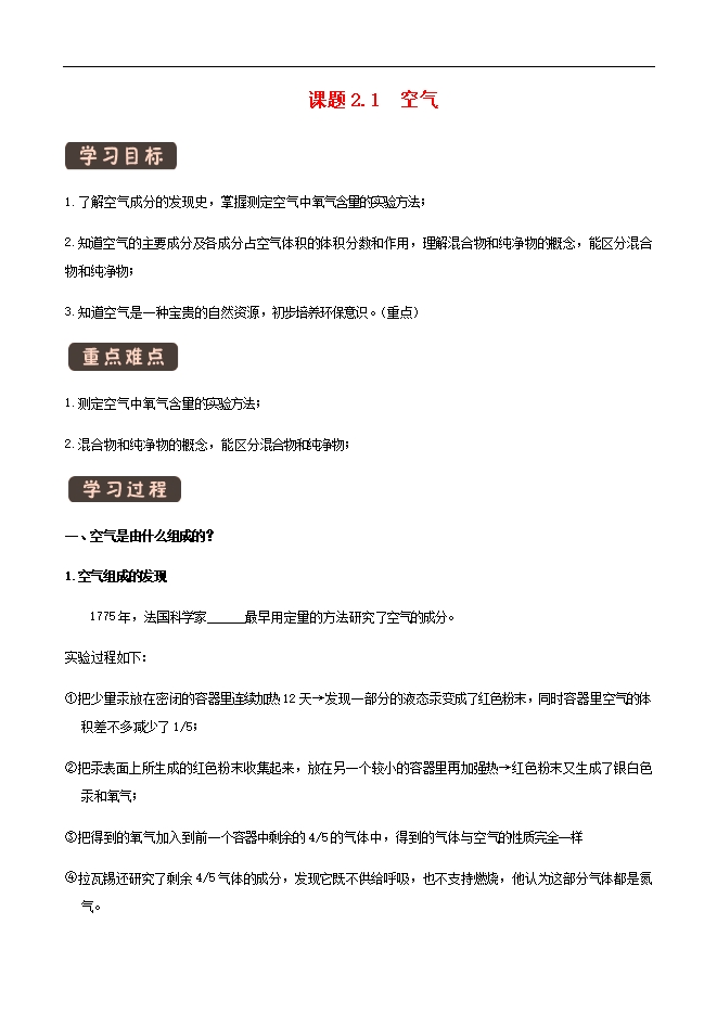 【内容简介】1.了解空气成分的发现史,掌握测定空气中氧气含量的实验方法;2.知道空气的主要成分及各成分占空气体积的体积分数和作用,理解混合物和纯净物的概念,能区分混合物和纯净物;3.知道空气是一种宝贵的自然资源,初步培养环保意识。(重点) 1.测定空气中氧气含量的实验方法;2.混合物和纯净物的概念,能区分混合物和纯净物; 一、空气是由什么组成的?1.空气组成的发现1775年,法国科学家 最早用定量的方法研究了空气的成分。实验过程如下:①把少量汞放在密闭的容器里连续加热12天→发现一部分的液态汞变成了红色粉末,同时容器里空气的体积差不多减少了1/5;②把汞表面上所生成的红色粉末收集起来,放在另一个较小的容器里再加强热→红色粉末又生成了银白色汞和氧气;③把得到的氧气加入到前一个容器中剩余的4/5的气体中,得到的气体与空气的性质完全一样④拉瓦锡还研究了剩余4/5气体的成分,发现它既不供给呼吸,也不支持燃烧,他认为这部分气体都是氮气。通过上述实验,拉瓦锡得出了结论:空气由氮气和氧气组成,其中氧气约占空气总体积的 。2.测定空气中氧气的含量(1)原理: ,过量的红磷燃烧时耗尽集气瓶内氧气,使瓶内气体减少,压强降低。打开弹簧夹后,烧杯里的水倒流入集气瓶中。进入集气瓶中水的体积就是集气瓶内被消耗的氧气的体积。(2)装置图:如右图所示。(3)现象:①红磷燃烧,发出黄色火焰,有大量 生成,放出热量;②冷却后,打开弹簧夹,水沿导管进入集气瓶,进入集气瓶内水的体积约占集气瓶内空气总体积的 。 (4)结论: 。......