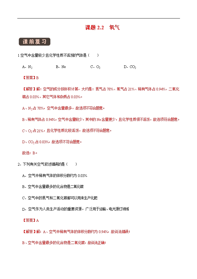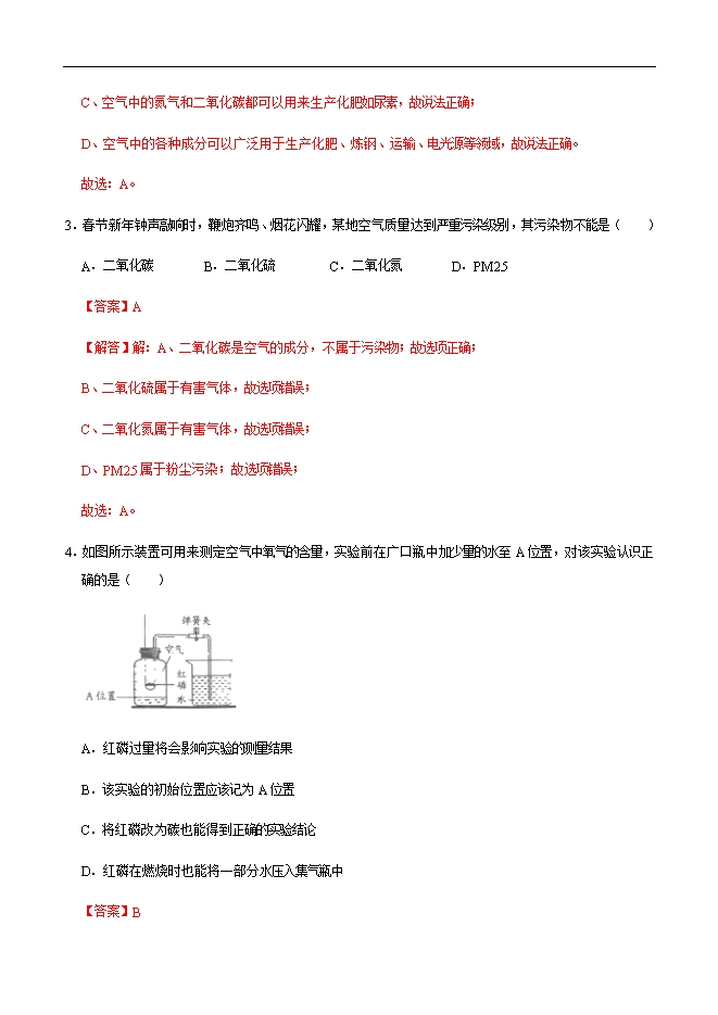 【内容简介】1空气中含量较少且化学性质不活泼的气体是( )A.N2 B.Ne C.O2 D.CO2【答案】B【解答】解:空气的成分按体积计算,大约是:氮气占78%、氧气占21%、稀有气体占0.94%、二氧化碳占0.03%、其它气体和杂质占0.03%。A、N2占78%,空气中含量最多,故选项不符合题意。B、稀有气体占0.94%,空气中含量较少,其中的Ne含量更少,且化学性质很不活泼,故选项符合题意。C、O2占21%,且化学性质比较活泼,故选项不符合题意。D、CO2占0.03%,故选项不符合题意。故选:B。2.下列有关空气叙述错误的是( )A.空气中稀有气体的体积分数约为0.03% B.空气中含量最多的化合物是二氧化碳 C.空气中的氮气和二氧化碳都可以用来生产化肥 D.空气作为人类生产活动的重要资源,广泛用于运输、电光源灯领域【答案】A【解答】解:A、空气中稀有气体的体积分数约为0.94%,故说法错误;B、空气中含量最多的化合物是二氧化碳,故说法正确;C、空气中的氮气和二氧化碳都可以用来生产化肥如尿素,故说法正确;D、空气中的各种成分可以广泛用于生产化肥、炼钢、运输、电光源等领域,故说法正确。故选:A。3.春节新年钟声敲响时,鞭炮齐鸣、烟花闪耀,某地空气质量达到严重污染级别,其污染物不能是( )A.二氧化碳 B.二氧化硫 C.二氧化氮 D.PM2.5【答案】A【解答】解:A、二氧化碳是空气的成分,不属于污染物;故选项正确;B、二氧化硫属于有害气体,故选项错误;C、二氧化氮属于有害气体,故选项错误;D、PM2.5属于粉尘污染;故选项错误;故选:A。4.如图所示装置可用来测定空气中氧气的含量,实验前在广口瓶中加少量的水至A位置,对该实验认识正确的是( )......