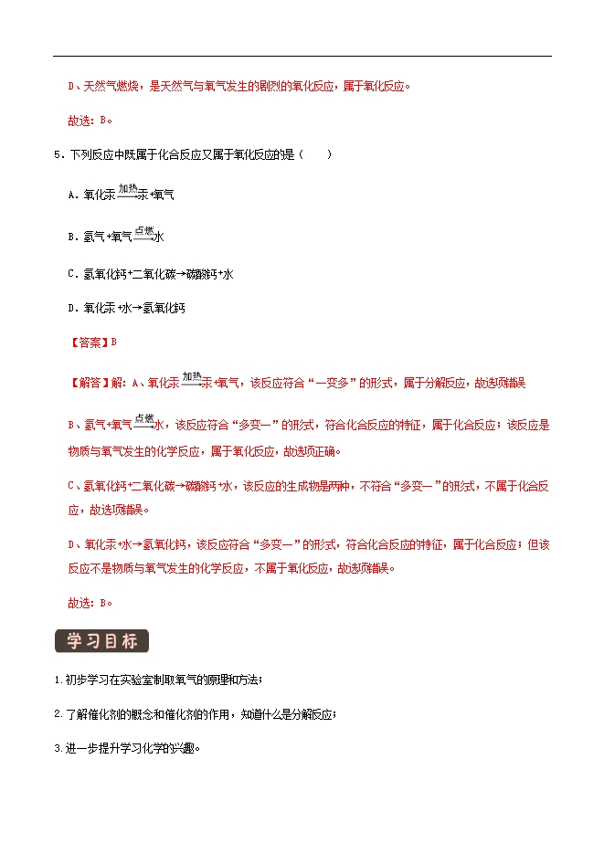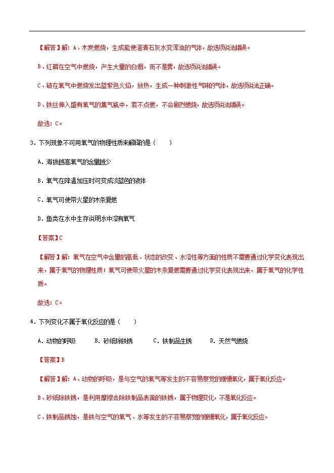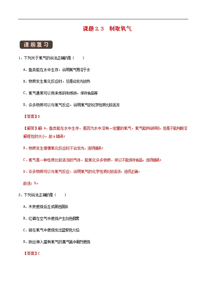 【内容简介】1.下列关于氧气的说法正确的是( )A.鱼类能在水中生存,说明氧气易溶于水 B.物质发生氧化反应时,总是会发光放热 C.氧气通常可以用来炼钢和炼铁,保存食品等 D.许多物质可以与氧气反应,说明氧气的化学性质比较活泼【答案】D【解答】解:A、鱼类能在水中生存,是因为水中溶有一定量的氧气,氧气能供给呼吸,但是不能判断溶解程性的大小,故A错误;B、物质发生缓慢氧化反应时不会发光,选项错误;C、氧气是一种性质比较活泼的气体,能氧化许多物质,所以不能保存食品,选项错误;D、许多物质可以与氧气反应,说明氧气的化学性质比较活泼,选项正确。故选:D。2.下列说法正确的是( )A.木炭燃烧后生成黑色固体 B.红磷在空气中燃烧产生白色烟雾 C.硫在氧气中燃烧发出蓝紫色火焰 D.铁丝伸入盛有氧气的集气瓶中剧烈燃烧【答案】C.....