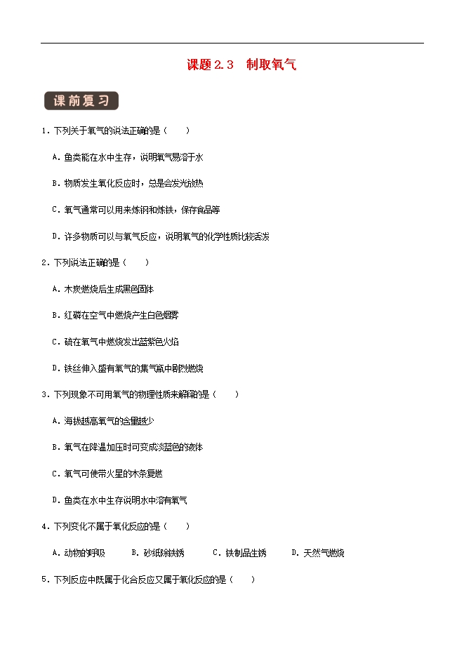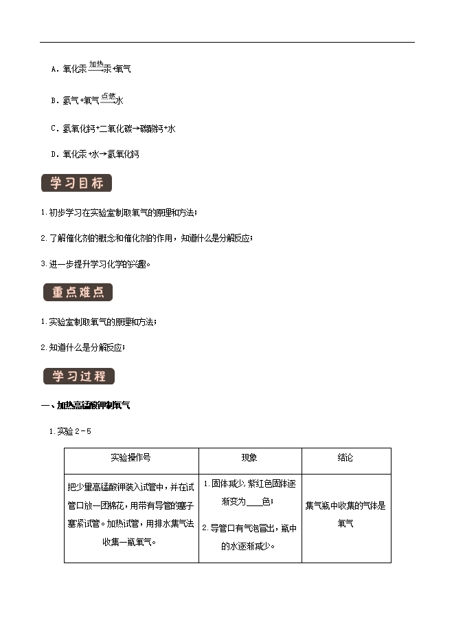 【内容简介】1.下列关于氧气的说法正确的是( )A.鱼类能在水中生存,说明氧气易溶于水 B.物质发生氧化反应时,总是会发光放热 C.氧气通常可以用来炼钢和炼铁,保存食品等 D.许多物质可以与氧气反应,说明氧气的化学性质比较活泼2.下列说法正确的是( )A.木炭燃烧后生成黑色固体 B.红磷在空气中燃烧产生白色烟雾 C.硫在氧气中燃烧发出蓝紫色火焰 D.铁丝伸入盛有氧气的集气瓶中剧烈燃烧3.下列现象不可用氧气的物理性质来解释的是( )A.海拔越高氧气的含量越少 B.氧气在降温加压时可变成淡蓝色的液体 C.氧气可使带火星的木条复燃 D.鱼类在水中生存说明水中溶有氧气4.下列变化不属于氧化反应的是( )A.动物的呼吸 B.砂纸除铁锈 C.铁制品生锈 D.天然气燃烧5.下列反应中既属于化合反应又属于氧化反应的是( )A.氧化汞 汞+氧气 B.氢气+氧气 水 C.氢氧化钙+二氧化碳→碳酸钙+水 D.氧化汞+水→氢氧化钙 1.初步学习在实验室制取氧气的原理和方法;2.了解催化剂的概念和催化剂的作用,知道什么是分解反应;3.进一步提升学习化学的兴趣。 1.实验室制取氧气的原理和方法;2.知道什么是分解反应;......