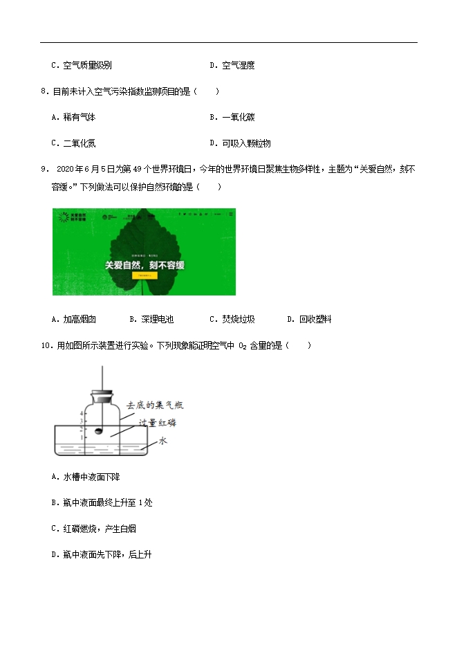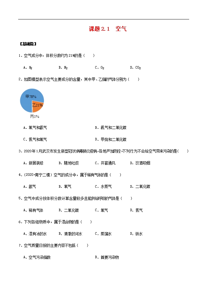 【内容简介】1.空气成分中,体积分数约为21%的是( )A.H2 B.N2 C.O2 D.CO22.如图模型表示空气主要成分的含量,其中甲、乙指的气体分别为( ) A.氧气和氢气 B.氦气和二氧化碳 C.氮气和氧气 D.甲烷和二氧化碳3. 2020年1月武汉市发生新型冠状病毒肺炎疫悄,各地严加防控。下列行为不会给空气带来污染的是( )A.新居装修 B.随地吐痰 C.开窗通风 D.饮酒吸烟4.(2020•南宁二模)空气的成分中,属于稀有气体的是( )A.氩气 B.氧气 C.水蒸气 D.二氧化碳5.空气中成分按体积分数计算含量较多且能供给呼吸的气体是( )A.稀有气体 B.二氧化碳 C.氧气 D.氮气6.下列各组物质中,属于混合物的是( )A.混有冰的水 B.清澈的河水 C.蒸馏水 D.铁水7.空气质量日报的主要内容不包括( )A.空气污染指数 B.首要污染物 C.空气质量级别 D.空气湿度8.目前未计入空气污染指数监测项目的是( )A.稀有气体 B.一氧化碳 C.二氧化氮 D.可吸入颗粒物9. 2020年6月5日为第49个世界环境日,今年的世界环境日聚焦生物多样性,主题为“关爱自然,刻不容缓。”下列做法可以保护自然环境的是( ) A.加高烟囱 B.深埋电池 C.焚烧垃圾 D.回收塑料10.用如图所示装置进行实验。下列现象能证明空气中 O2 含量的是( ) A.水槽中液面下降 B.瓶中液面最终上升至1处 C.红磷燃烧,产生白烟 D.瓶中液面先下降,后上升......