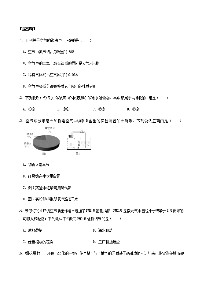 【精品】2021秋人教版初中化学《课题2.1 空气》基础和提高练习(原卷版)