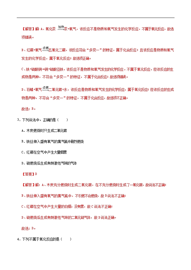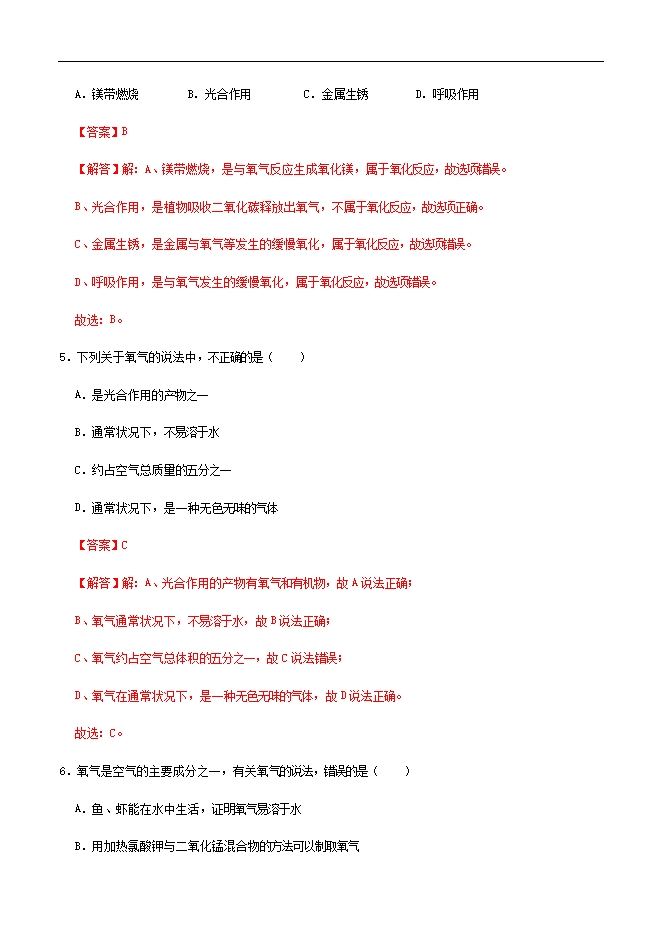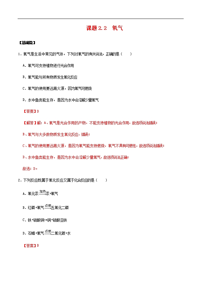 【内容简介】1.氧气是生活中常见的气体,下列对氧气的有关说法,正确的是( )A.氧气可支持植物进行光合作用 B.氧气能与所有物质发生氧化反应 C.氧气的使用要远离火源,因为氧气可燃烧 D.水中鱼类能生存,是因为水中会溶解少量氧气【答案】D【解答】解:A、氧气是光合作用的产物,不能支持植物的光合作用,故选项说法错误;B、氧气与大多数物质发生氧化反应,错误;C、氧气的使用要远离火源,是因为氧气能支持燃烧,氧气不具有可燃性,故选项说法错误;D、水中鱼类能生存,是因为水中会溶解少量氧气,故选项说法正确;故选:D。2.下列反应既属于氧化反应又属于化合反应的是( )A.氧化汞 汞+氧气 B.红磷+氧气 五氧化二磷 C.铁+硫酸铜→铜+硫酸亚铁 D.石蜡+氧气 二氧化碳+水【答案】B【解答】解:A、氧化汞 汞+氧气,该反应不是物质和氧气发生的化学反应,不属于氧化反应,故选项错误。B、红磷+氧气 五氧化二磷,该反应符合“多变一”的特征,属于化合反应;且该反应是物质和氧气发生的化学反应,属于氧化反应;故选项正确。C、铁+硫酸铜→铜+硫酸亚铁,该反应不是物质和氧气发生的化学反应,不属于氧化反应,但该反应的生成物是两种,不符合“多变一”的特征,不属于化合反应;故选项错误。D、石蜡+氧气 二氧化碳+水,该反应是物质和氧气发生的化学反应,属于氧化反应;但该反应的生成物是两种,不符合“多变一”的特征,不属于化合反应,故选项不正确。故选:B。3.下列说法中,正确的是( )A.木炭燃烧时只生成二氧化碳 B.铁丝伸入盛有氧气的集气瓶中剧烈燃烧 C.红磷在空气中产生大量烟雾 D.硫燃烧后生成有刺激性气味的气体【答案】D【解答】解:A、木炭充分燃烧时生成二氧化碳,在不充分燃烧时生成了一氧化碳,故说法不正确;B、铁丝伸入盛有氧气的集气瓶中,不引燃不会燃烧,故B说法不正确;C、红磷在空气中产生大量的白烟,没有雾,故C说法不正确;D、硫燃烧后生成有刺激性气味的二氧化硫气体,故D说法正确。故选:D。4.下列不属于氧化反应的是( )......