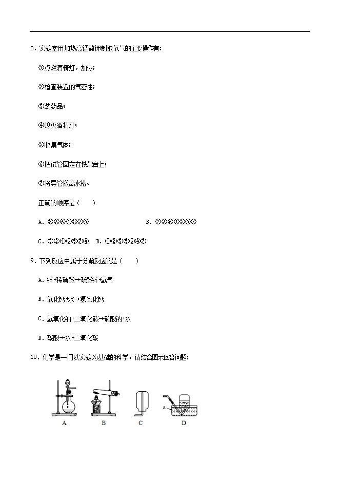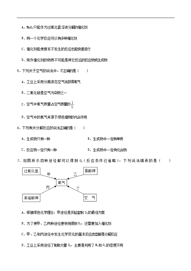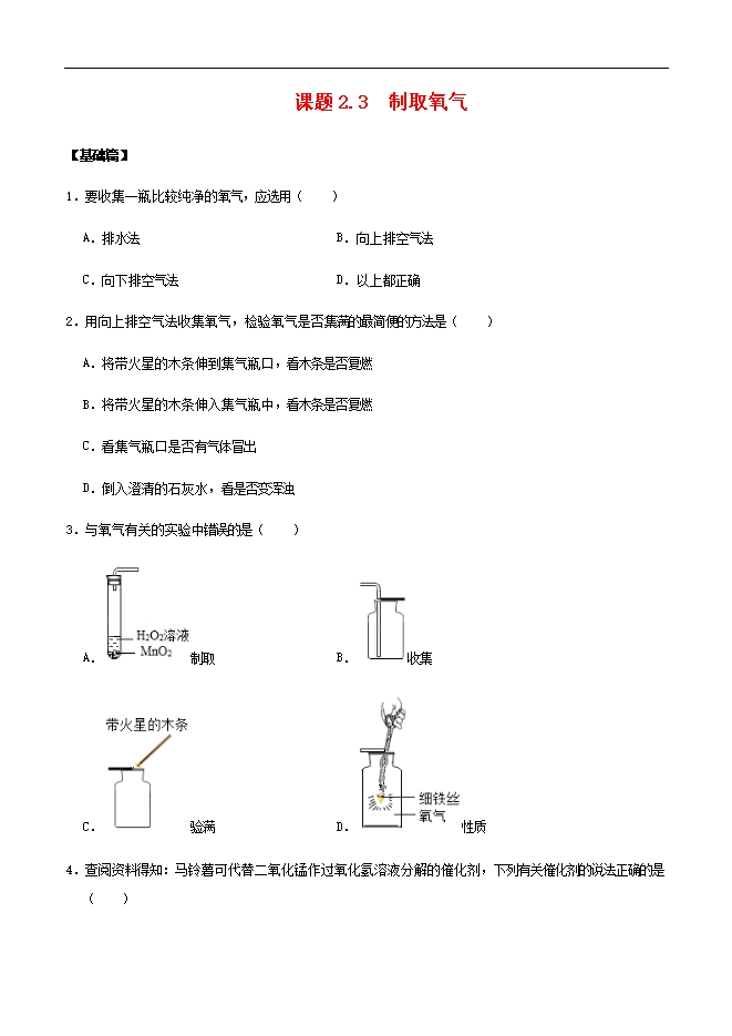【内容简介】1.要收集一瓶比较纯净的氧气,应选用( )A.排水法 B.向上排空气法 C.向下排空气法 D.以上都正确2.用向上排空气法收集氧气,检验氧气是否集满的最简便的方法是( )A.将带火星的木条伸到集气瓶口,看木条是否复燃 B.将带火星的木条伸入集气瓶中,看木条是否复燃 C.看集气瓶口是否有气体冒出 D.倒入澄清的石灰水,看是否变浑浊3.与氧气有关的实验中错误的是( )A. 制取 B. 收集 C. 验满 D. 性质4.查阅资料得知:马铃薯可代替二氧化锰作过氧化氢溶液分解的催化剂,下列有关催化剂的说法正确的是( )A.MnO2只能作为过氧化氢溶液分解的催化剂 B.同一个化学反应可以有多种催化剂 C.催化剂能使原本不发生的反应也能快速进行 D.用作催化剂的物质不可能是其它反应的反应物或生成物5.下列关于空气的说法中,不正确的是( )A.工业上采用分离液态空气法获得氧气 B.二氧化硫是空气污染物之一 C.空气中氧气质量占空气质量的 D.空气中的氧气来源于绿色植物的光合作用6.下列有关分解反应的说法正确的是( )A.生成物只有一种 B.生成物中一定有单质 C.反应物一定只有一种 D.生成物中一定有化合物7.如图所示四种途径都可以得到O2(反应条件已省略),下列说法错误的是 ......