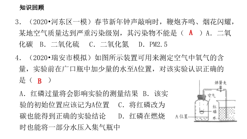 【内容简介】若实验室有一瓶无色、无味的气体,如何才能知道这瓶气体是不是氧气呢?我们结合氧气的化学性质可以解决这一问题,我们先来做一个小实验.用坩埚钳夹取一小块木炭,在酒精灯上加热至燃烧,然后将木炭由上而下缓慢放入盛有氧气的集气瓶中。观察燃烧现象。①木炭在空气中发出红光,放出热量,生成无色气体;②在氧气中剧烈燃烧,发出白光,放出热量,生成无色气体.【练一练】(2020•北辰区二模)下列对实验现象描述正确的是( )A.红磷在空气中燃烧,放出热量,产生大量白雾 B.铁丝在氧气中燃烧,生成气体使澄清石灰水变浑浊 C.镁条在空气中燃烧,发出耀眼的白光,生成黑色固体 D.蜡烛在空气中燃烧,火焰上方的干冷烧杯中出现水雾......