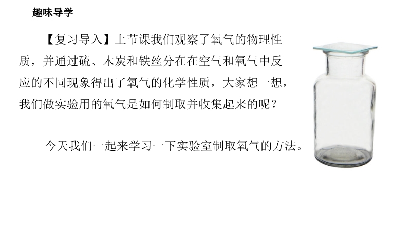 【内容简介】【复习导入】上节课我们观察了氧气的物理性质,并通过硫、木炭和铁丝分在在空气和氧气中反应的不同现象得出了氧气的化学性质,大家想一想,我们做实验用的氧气是如何制取并收集起来的呢?今天我们一起来学习一下实验室制取氧气的方法:实验室制取氧气的常用方法有三种:1.加热高锰酸钾(KMnO4)2.分解过氧化氢(H2O2)溶液3.加热氯酸钾(KClO3)和二氧化锰(MnO2)的混合物注意:应先预热,再用外焰集中加热盛放药品的部位,防止试管受热不均而破裂注意:加热开始所产生的气泡不宜收集,当气泡连续、均匀放出时,再把导管口伸入集气瓶内收集氧气常见气体的收集方法有以下几种,根据氧气的性质,选择适合氧气的收集方法......