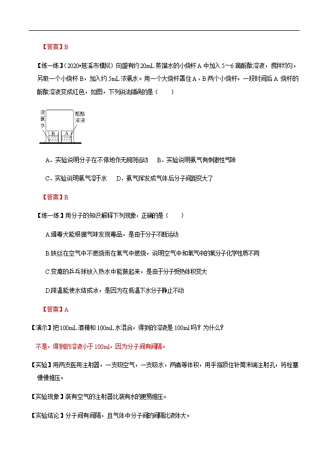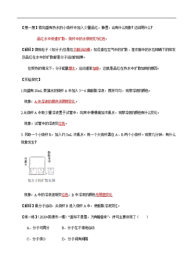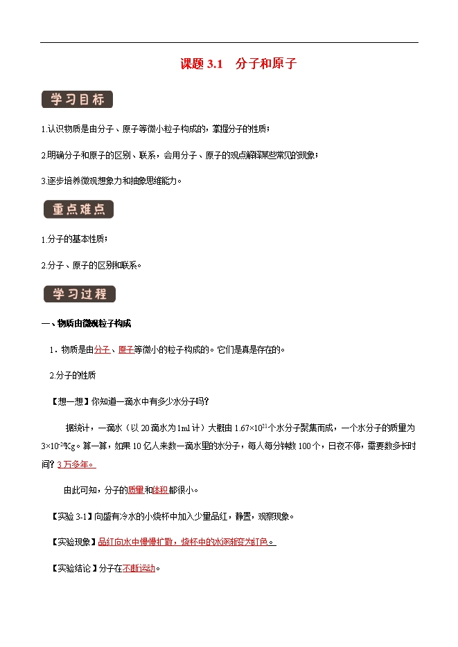 【内容简介】1.认识物质是由分子、原子等微小粒子构成的,掌握分子的性质;2.明确分子和原子的区别、联系,会用分子、原子的观点解释某些常见的现象;3.逐步培养微观想象力和抽象思维能力。 1.分子的基本性质;2.分子、原子的区别和联系。 一、物质由微观粒子构成1.物质是由分子、原子等微小的粒子构成的。它们是真是存在的。2.分子的性质【想一想】你知道一滴水中有多少水分子吗?据统计,一滴水(以20滴水为1ml计)大概由1.67×1021个水分子聚集而成,一个水分子的质量为3×10-26Kg。算一算,如果10亿人来数一滴水里的水分子,每人每分钟数100个,日夜不停,需要数多长时间?3万多年。由此可知,分子的质量和体积都很小。【实验3-1】向盛有冷水的小烧杯中加入少量品红,静置,观察现象。【实验现象】品红向水中慢慢扩散,烧杯中的水逐渐变为红色。【实验结论】分子在不断运动。【想一想】若向盛有热水的小烧杯中加入少量品红,静置,会有什么现象?这说明什么?品红水中快速扩散,烧杯中的水很快变为红色。【解释】微观粒子(如分子)总是在不断运动着,如花香在空气中的扩散、湿衣服中的水在晾晒下的挥发及品红在水中的扩散都是分子运动的结果。 在受热的情况下,分子能量增大,运动速率加快,这就是品红在热水中扩散加快的原因。【实验探究】1.向盛有20mL蒸馏水的烧杯A中加入5~6滴酚酞溶液,搅拌均匀,观察溶液的颜色。 ......