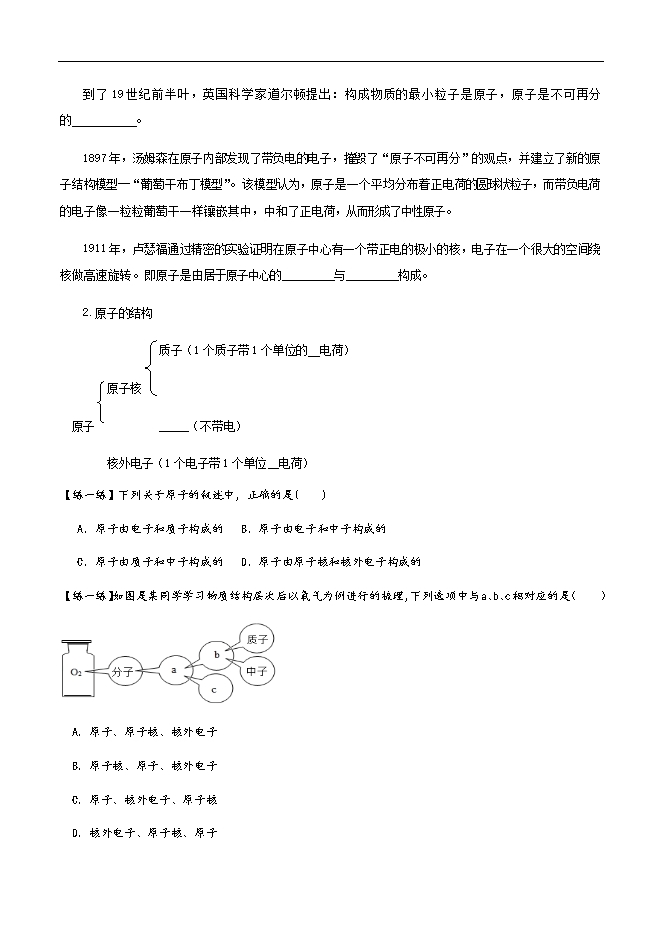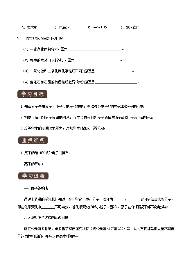 【内容简介】1. “不经一番寒彻骨,怎得梅花扑鼻香”,从微观角度分析,诗人能闻到梅花香气的主要原因是( )A.分子的体积和质量都很小 B.分子间有一定的间隔 C.分子在不断地运动 D.分子可以再分2.家庭用液化石油气是丙烷、丁烷等气体经加压后压缩到钢瓶中的,气体能被压缩的原因是( )A.分子质量和体积很小 B.分子体积变小 C.分子在不断运动 D.分子间有间隔3.下列事实用微粒的知识解释错误的是( ) 选项 事实 解释A 冰水混合物是纯净物 由同种分子构成B 夏天铜质的电线下垂 温度升高,铜原子间的间隔变大C 氯化钠在热水中溶解得更快 受热情况下,分子能量增大,运动速率加快D 金刚石硬而石墨软 碳原子的排列方式不同A.A B.B C.C D.D4.下列变化能证明分子可以再分的是( )A.水蒸发 B.电解水 C.干冰升华 D.硬水软化5.用微粒的观点回答下列问题:(1)干冰汽化体积变大,因为 。(2)杯中的水敞口不断减少,因为 。(3)一氧化碳和二氧化碳化学性质不同的原因是 。(4)金刚石和石墨的物理性质差异很大的原因是 。 1.知道原子是由质子、中子、电子构成的,掌握核外电子的排布规律和离子的形成;2.初步了解相对原子质量的概念,并学会有关相对原子质量与质子数和中子数之间的关系:3.培养学生的空间想象能力,增加学生对微观世界的认识 1.原子的结构和核外电子的排布;2.离子的形成。 一、原子的构成通过上节课的学习我们知道,在化学变化中,分子可以分为 , 又可以结合成新分子。即在化学变化中 不可再分,是化学变化的最小粒子。那么,原子在任何情况下都不能再分吗?1.人类对原子结构的认识过程远在公元前5世纪,希腊哲学家德谟克利特(约公元前460~前370)等,认为万物都是由大量不可再分的微粒构成的,并把这种微粒叫做原子。......